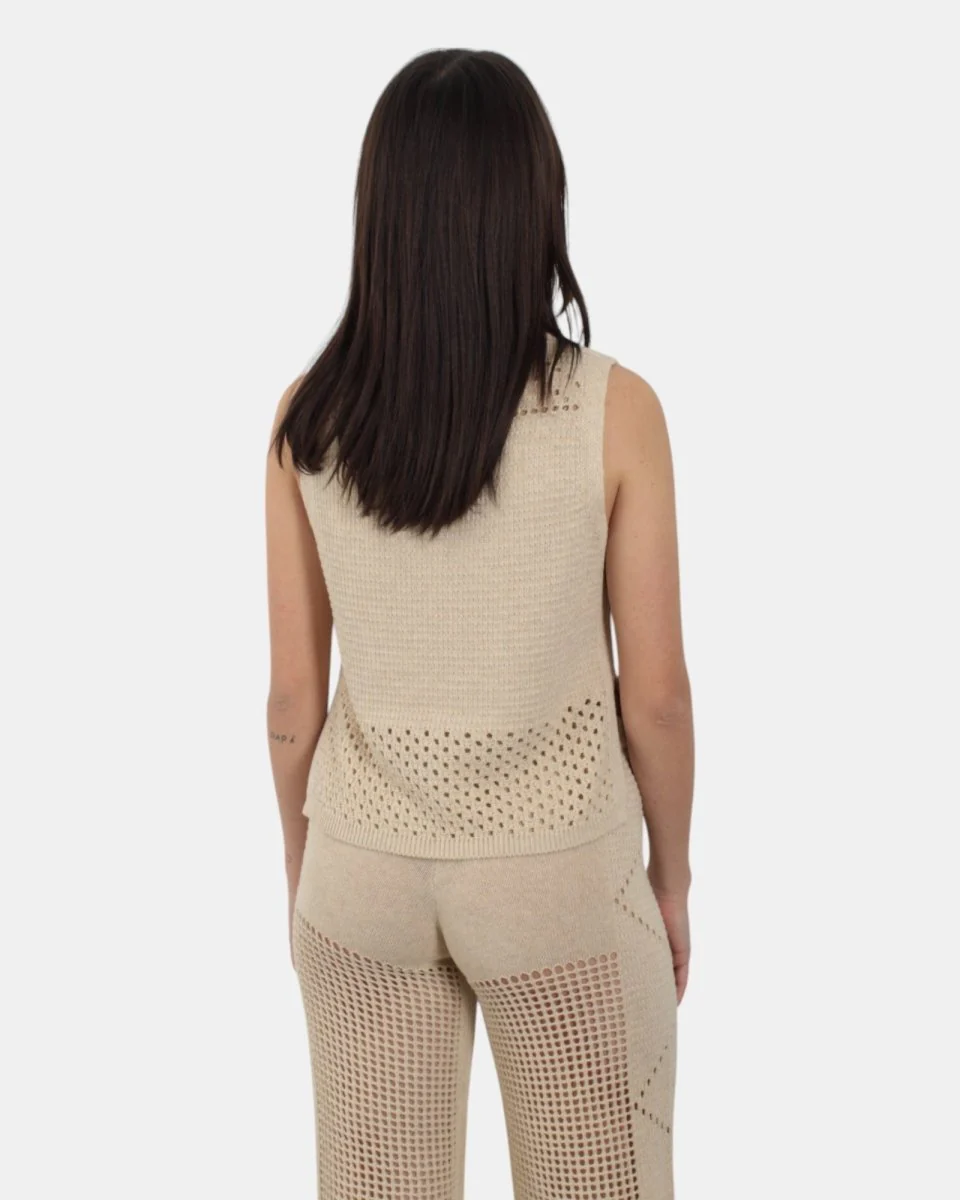 La canotta di MC2 Saint Barth presenta fantasia traforata, ricami con losanghe , due pacchetti laterali, dalla mano fresca dovuta alla sua composizione in 50% poliuretanica e 50% cotone. Si consiglia lavaggio a mano. La modella è alta 1,68 m e indossa una S
