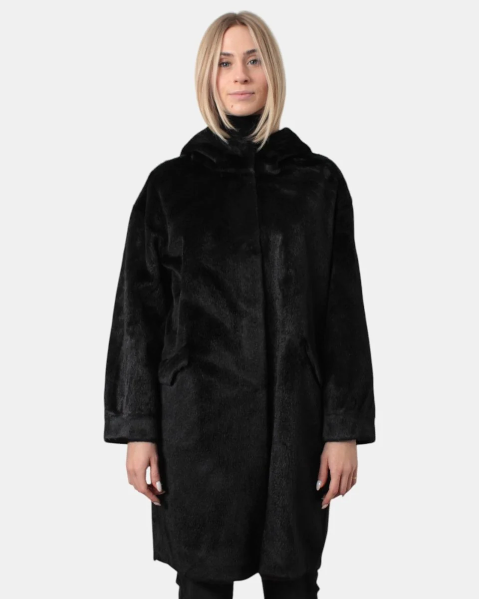 Il cappotto lungo con cappuccio di Leon&loulou in ecopelliccia presenta due tasche frontali oblique a filo con pattina, chiusura a bottoni frontale, dalla mano morbida e calda dovuta alla sua composizione in 100% poliestere. Si consiglia lavaggio a secco. La modella è alta 1,67m e indossa una M