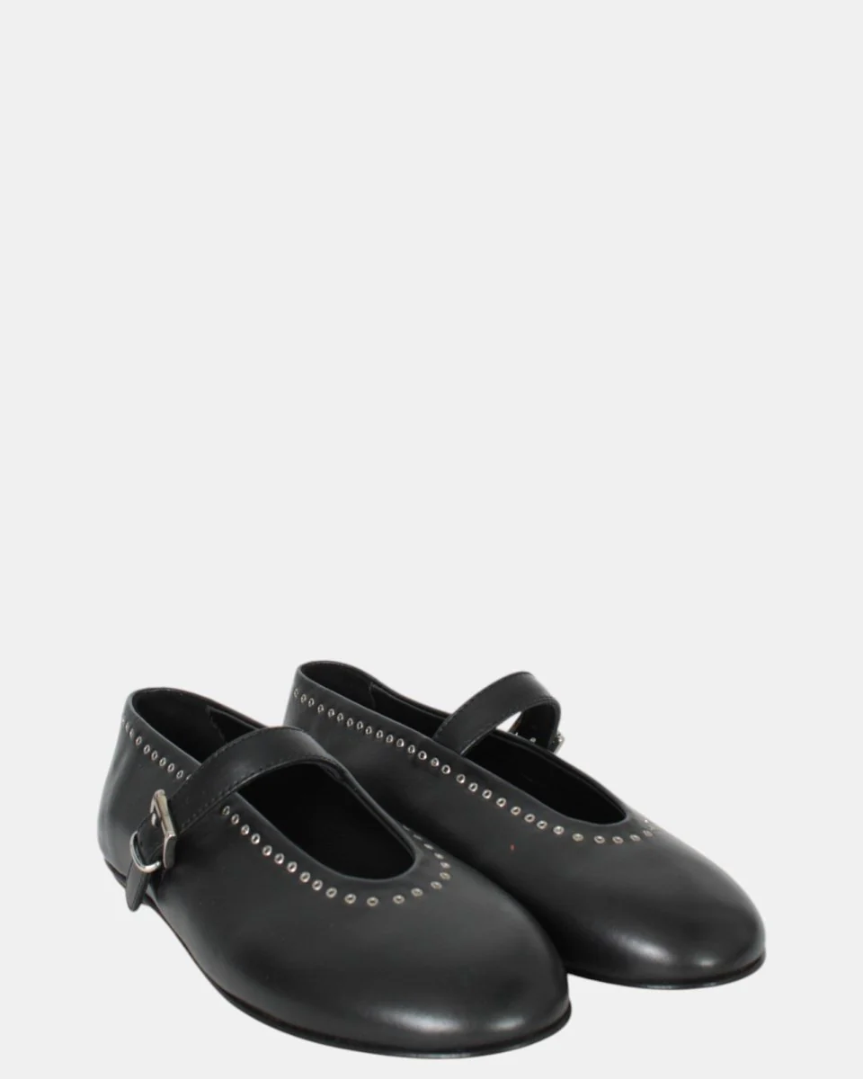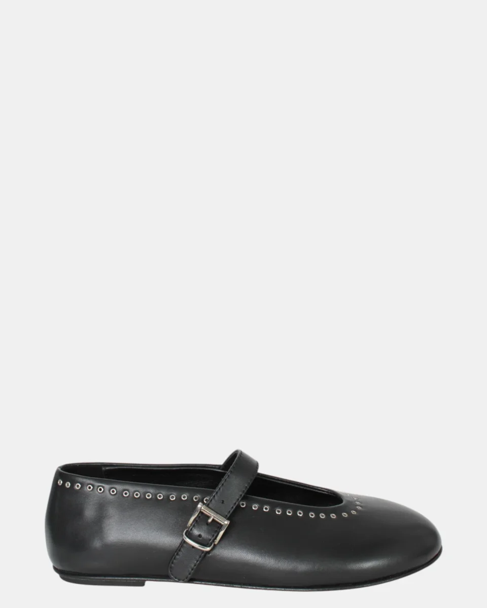 La ballerina di Liviana Conti presenta cinturino nero , con fibietta argentata e dettaglio sulla tomaio con forellini in acciaio, con tacchetto 0,3 cm