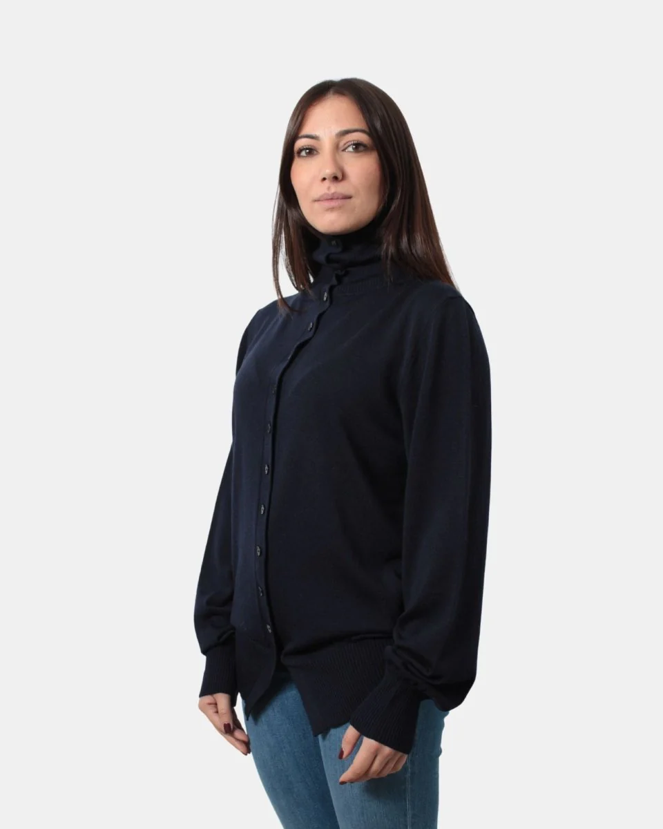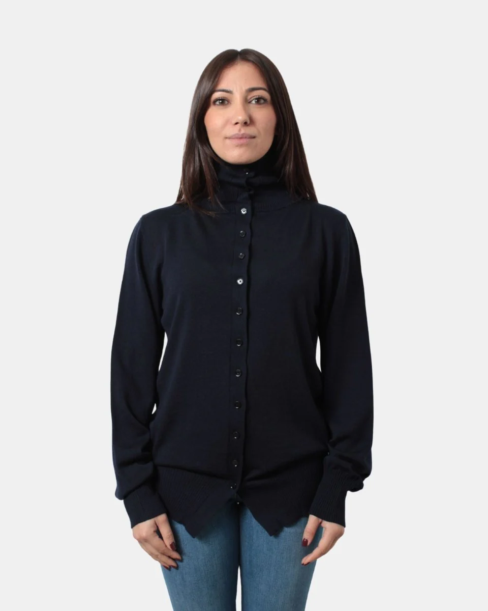 Il cardigan di Liviana Conti presenta chiusura frontale a tredici bottoni, fondo, collo e polsi a costine, dalla mano morbida e soffice dovuta alla sua composizione in 100% lana vergine. Si consiglia lavaggio a mano. La modella è alta 1,67 m e indossa una M