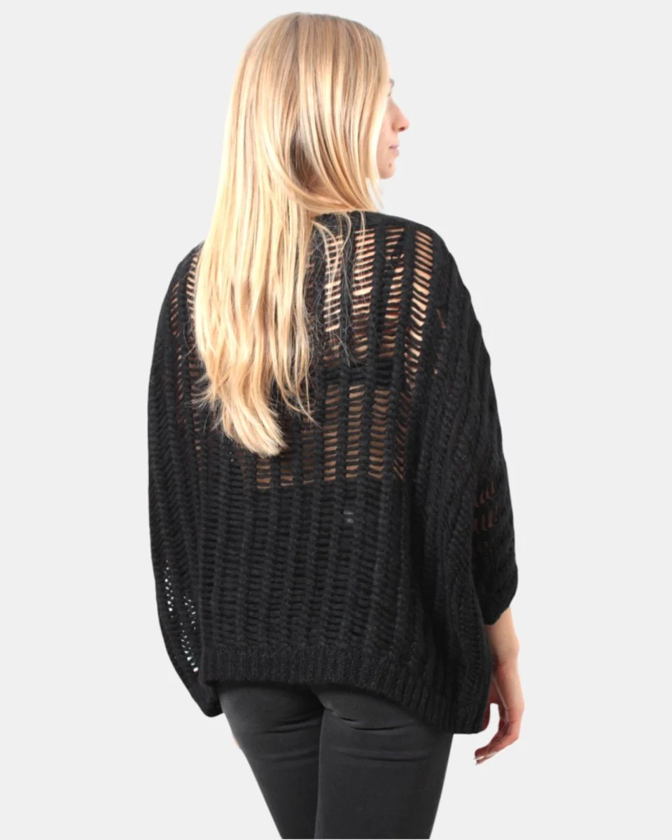 La maglia a girocollo di Liviana Conti presenta fantasia a losanghe intrecciate , giro sceso e manica corta, caratterizzata da buchi che fanno trasparire la maglia . Dalla mano soffice e calda dovuta alla sua composizione in 68% alpaca, 22% poliammide e 10% lana. Si consiglia lavaggio a max 30 gradi La modella è alta 1,67 m e indossa una M