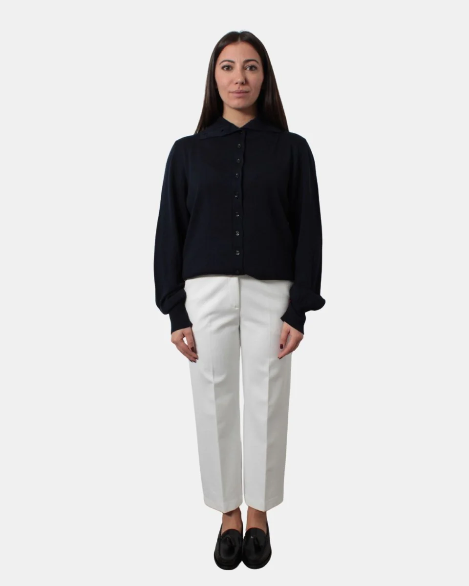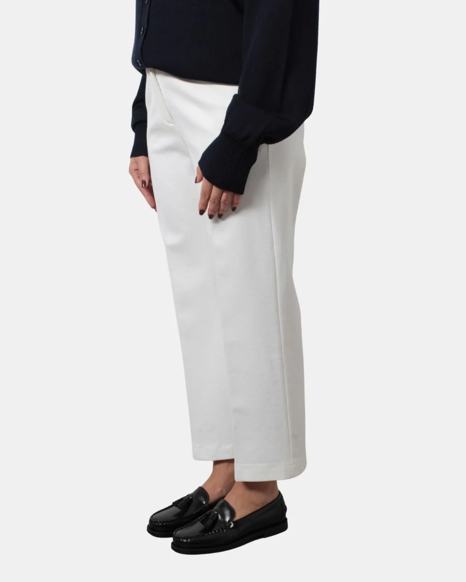 Il pantalone di Liviana conti presenta elastico con coulisse e spacchetti sul fondo, modello a zampa , dalla mano morbida dovuta alla sua composizione in 68% viscosa, 27% poliammide e 5% elastan. Si consiglia lavaggio a mano. La modella è alta 1,69 m e indossa una 40