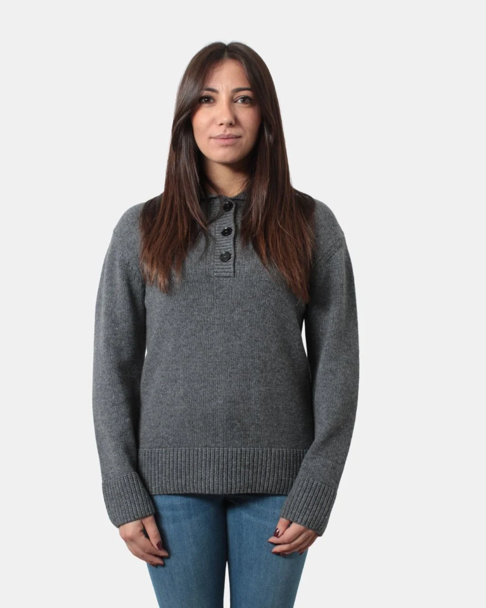 La polo a manica lunga con collo alto di Liviana Conti presenta chiusura a tre bottoni, fondo, collo e polsi a costine, dalla mano calda e morbida dovuta alla sua composizione in 50% cashmere e 50% poliammide. Si consiglia il lavaggio a mano. La modella è alta 1,67 m e indossa una XS