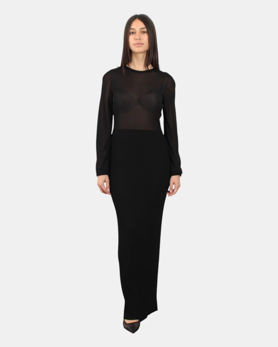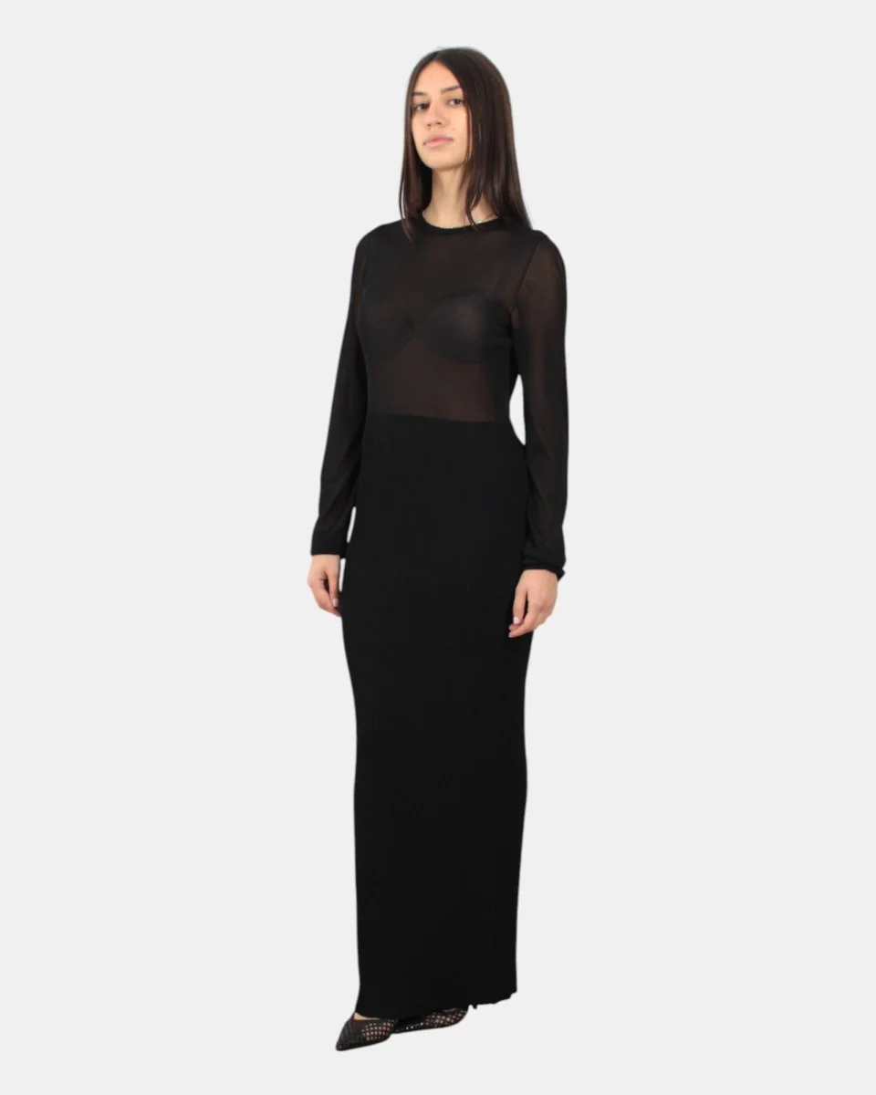 L’abito di Liviana Conti presenta fantasia trasparente nella parte superiore, fantasia a costine nella parte inferiore, scollatura sul retro, dalla mano fresca dovuta alla sua composizione in 65% viscosa 35% poliammide . SI consiglia lavaggio a mano. La modella è alta 1,68 m e indossa una M