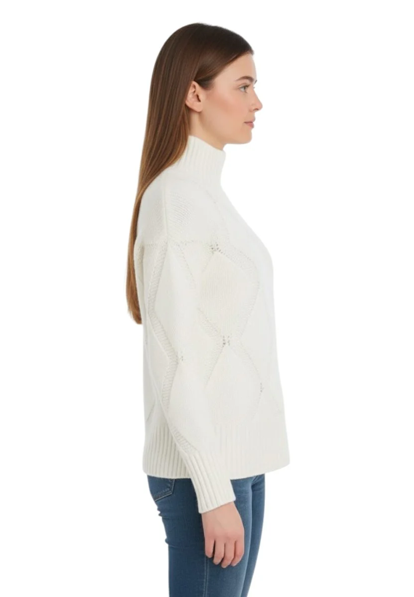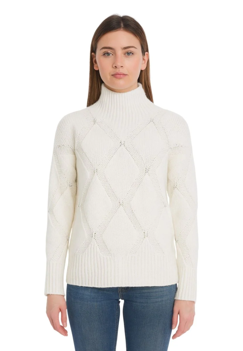 La texture morbida e calda la rende perfetta per le giornate più fredde, garantendo massima protezione senza rinunciare allo stile. Lavorata con cura, questa maglia presenta un motivo a rombi che aggiunge un tocco di classe al tuo outfit.