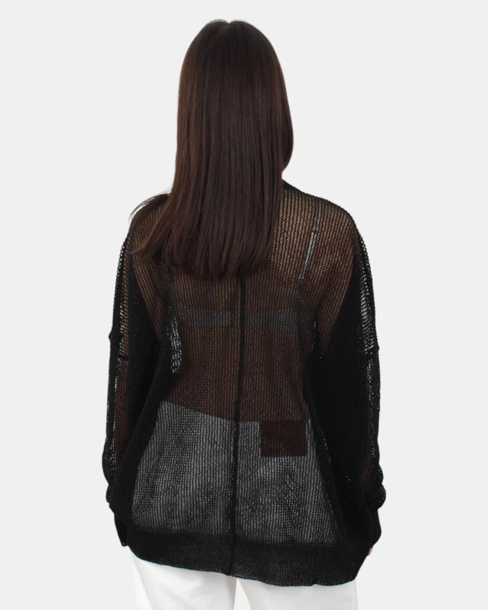 La maglia di Jei-O presenta scollatura frontale a V, fantasia traforata, vestibilità ampia, dalla mano fresca dovuta alla sua composizione in 70% cotone e 30% poliammide. Si consiglia lavaggio a massimo 30 gradi. La modella è alta 1,68 m e indossa una S