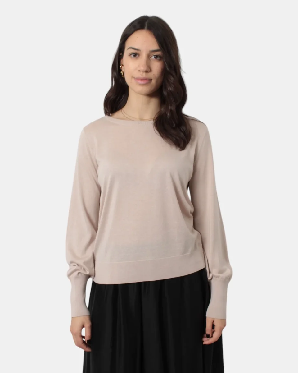 La maglia a girocollo di Kangra presenta collo, fondo e polsi a costine, spacchetti laterali, dalla mano morbida e soffice dovuta alla sua composizione in 85% seta e 15% cashmere. Si consiglia lavaggio a mano. La modella è alta 1,68 m e indossa una 42