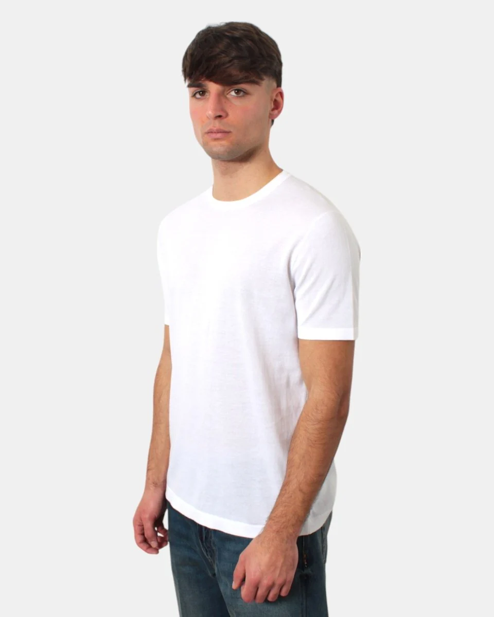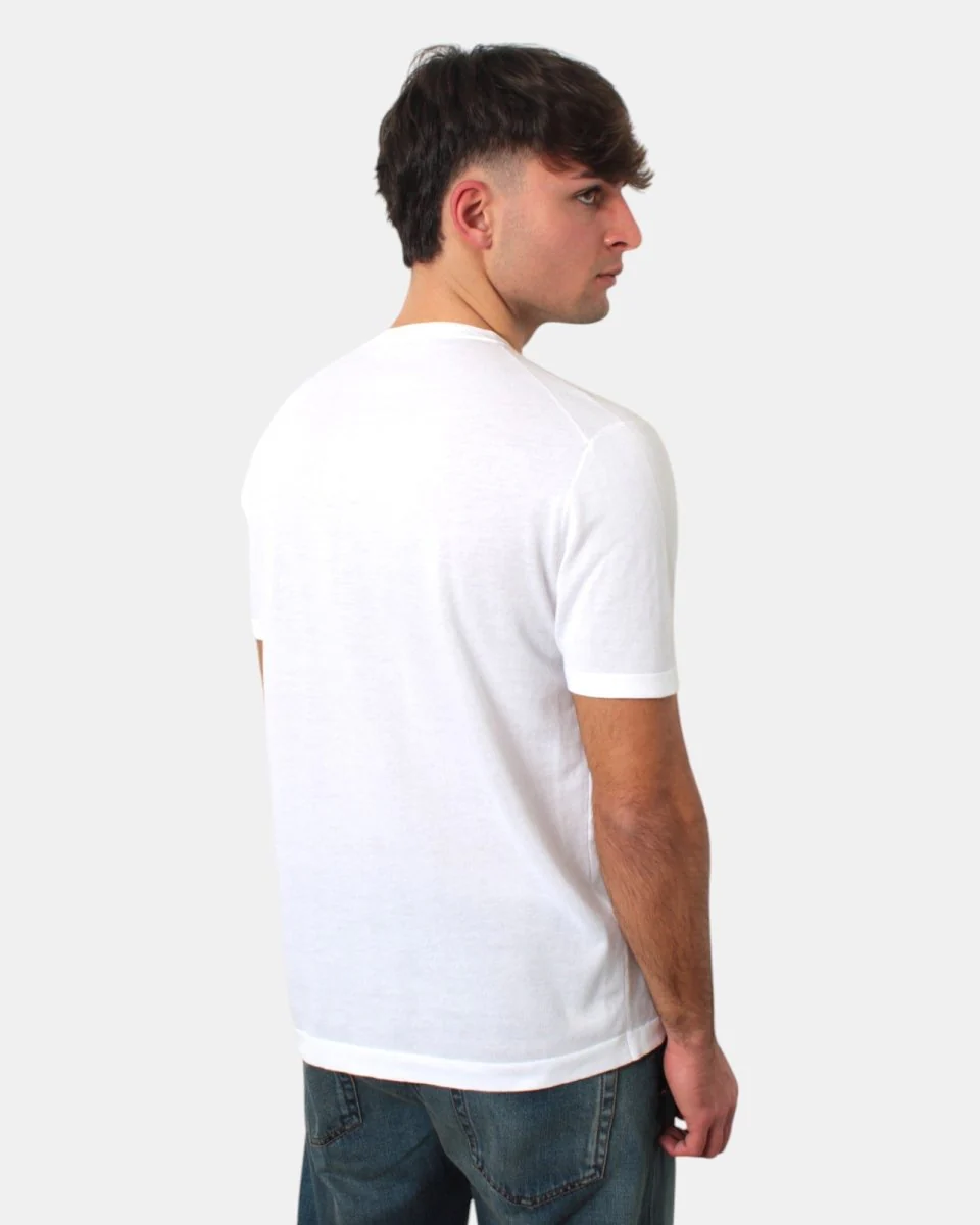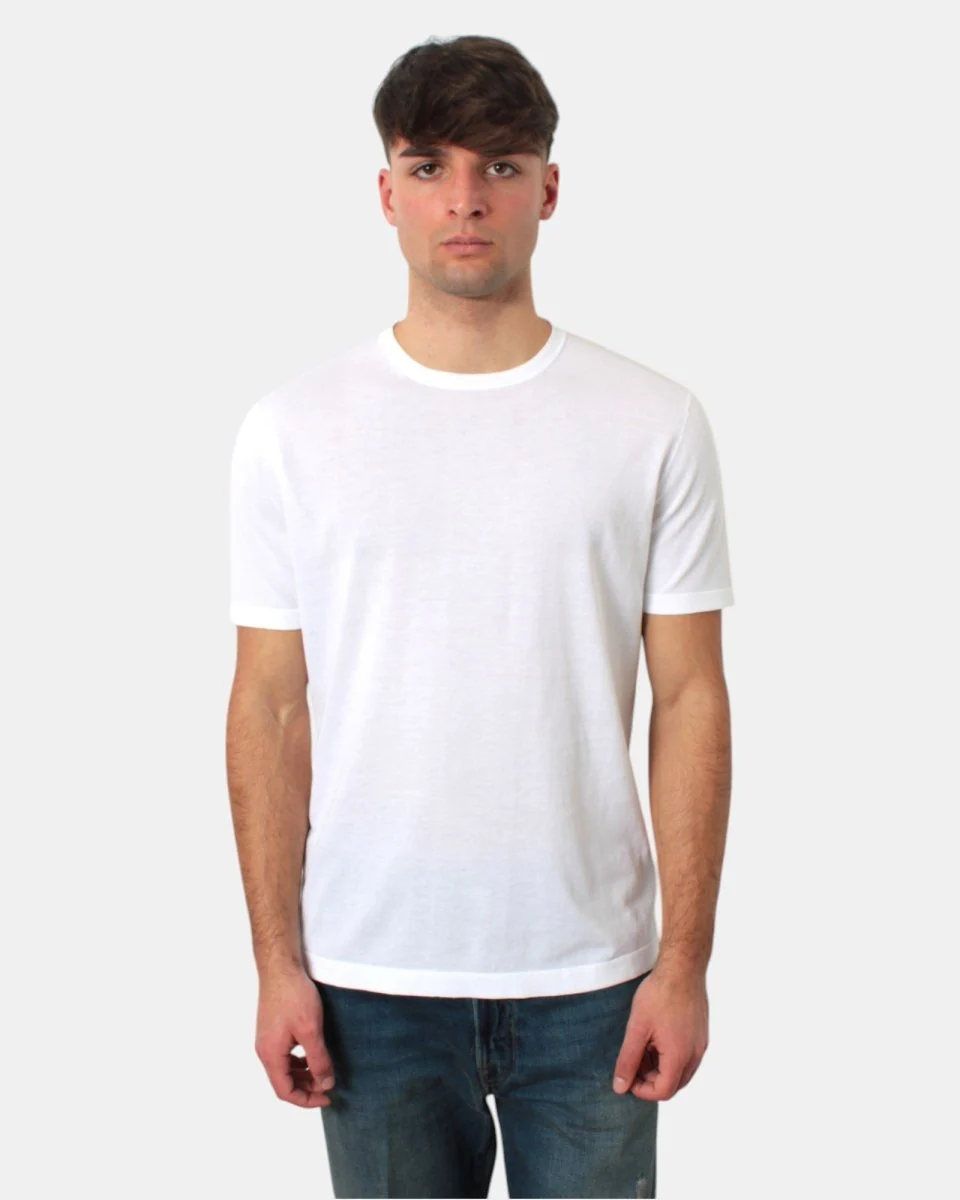 La maglia a maniche corte fantasia monocolore di Kangra presenta mano fresca e morbida dovuta alla sua composizione in 100% cotone, si consiglia lavaggio a mano. Il modello è alto 1,78 m e indossa una 48