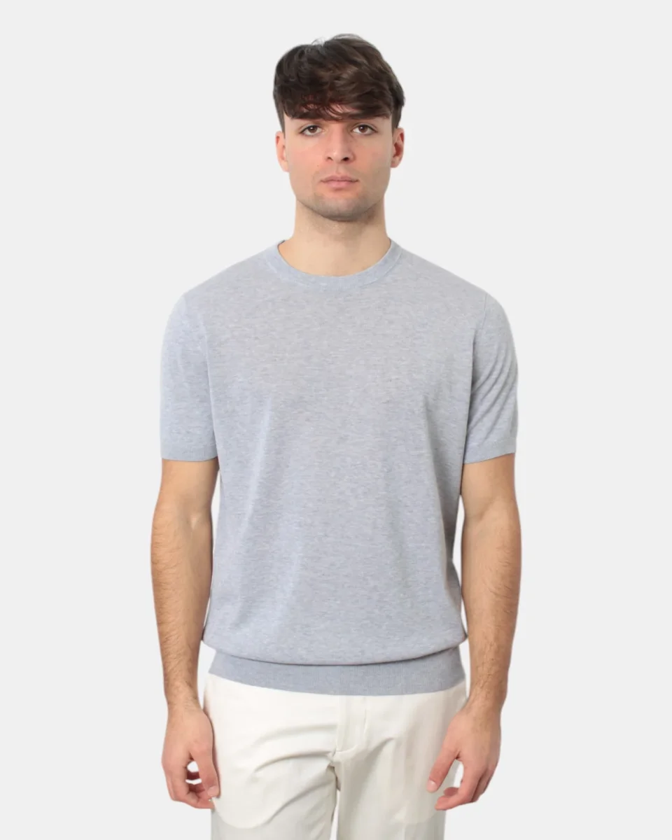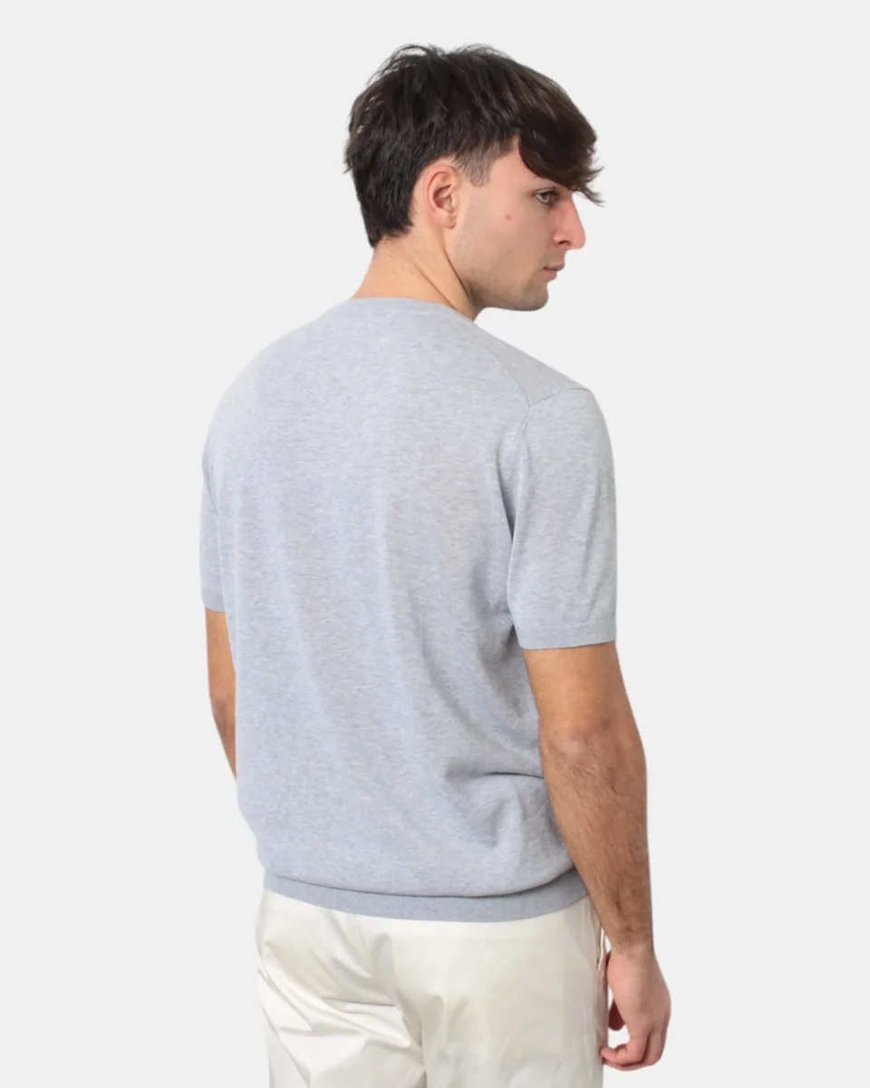 La maglia a girocollo a maniche corte di Kangra presenta, maniche, fondo e collo a costine, fantasia monocolore, dalla mano fresca e morbida dovuta alla sua composizione in 100% cotone. Si consiglia lavaggio a mano. Il modello è alto 1,78 m e indossa una 50
