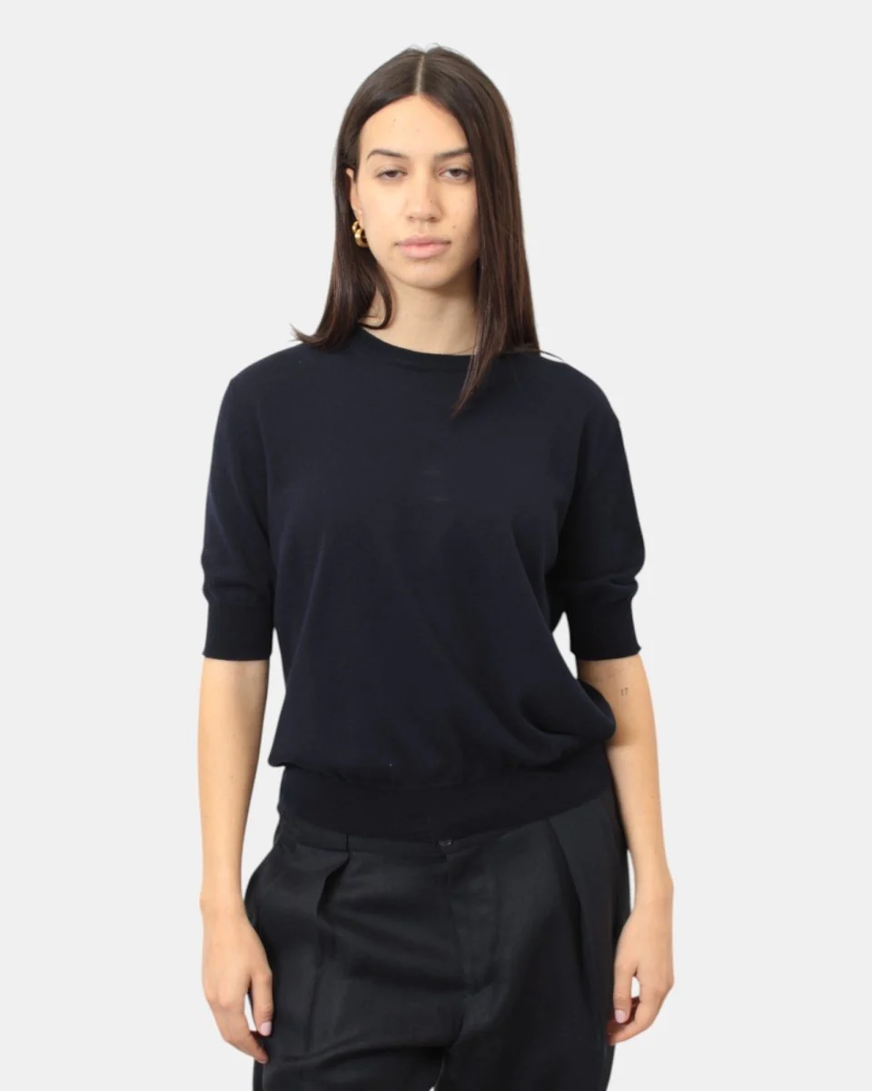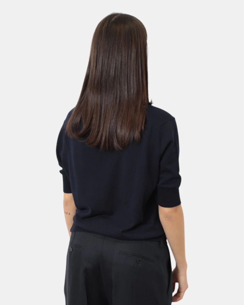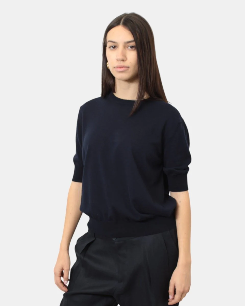 La maglia rasata a girocollo a maniche corte di Kangra presenta collo, fondo e manica a costine, fantasia monocolore, dalla mano morbida dovuta alla sua composizione in 100% cotone. Si consiglia lavaggio a mano. La modella è alta 1,68 m e indossa una 42