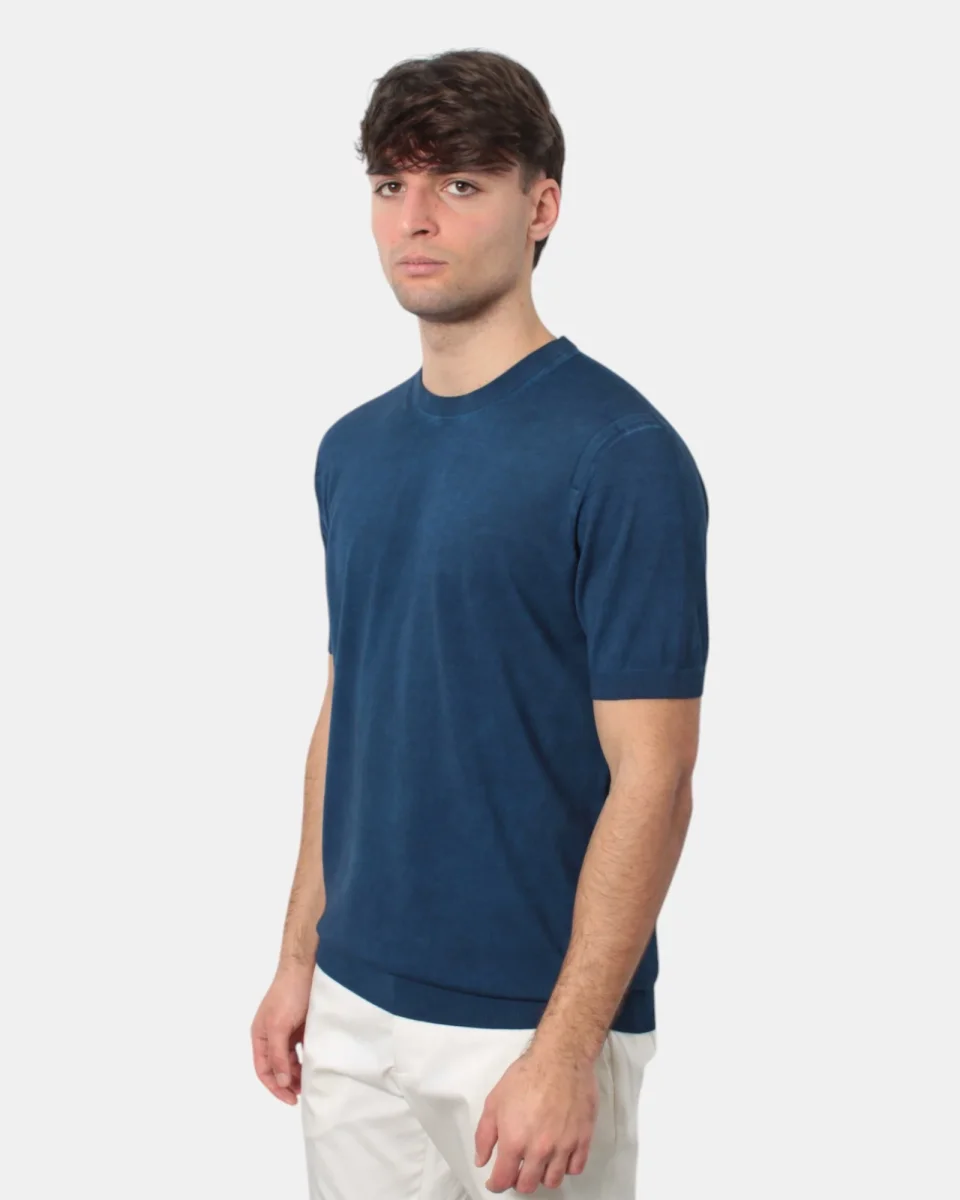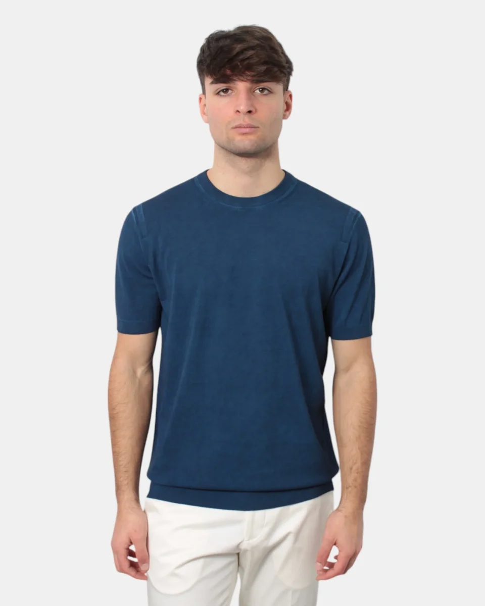 La maglia a girocollo a maniche corte di Kangra presenta, maniche, fondo e collo a costine, fantasia monocolore, dalla mano fresca e morbida dovuta alla sua composizione in 100% cotone. Si consiglia lavaggio a mano. Il modello è alto 1,78 m e indossa una 50