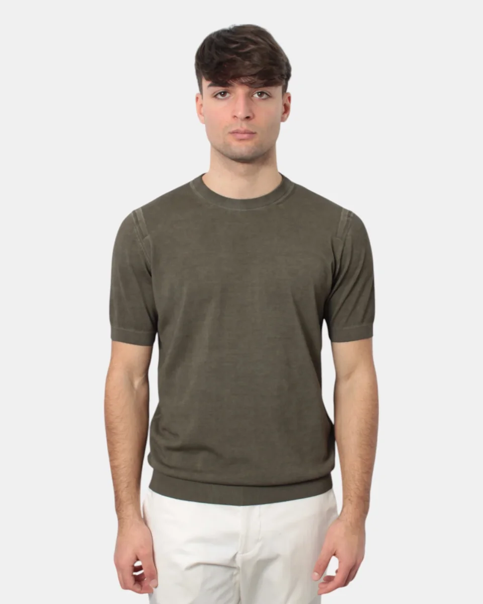 La maglia a girocollo a maniche corte di Kangra presenta, maniche, fondo e collo a costine, fantasia monocolore, dalla mano fresca e morbida dovuta alla sua composizione in 100% cotone. Si consiglia lavaggio a mano. Il modello è alto 1,78 m e indossa una 50