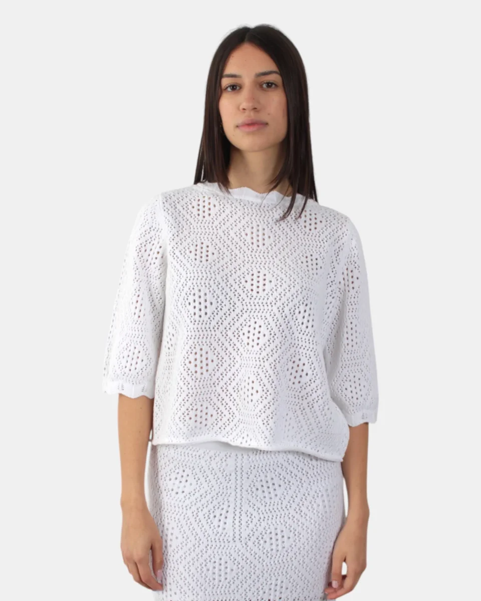 La maglia a girocollo di Liviana Conti presenta fantasia traforata, giro sceso, manica corta, chiusura a tre bottoni sul retro, dalla mano fresca dovuta alla sua composizione in 100% cotone. SI consiglia lavaggio a mano. La modella è alta 1,68 m e indossa una S