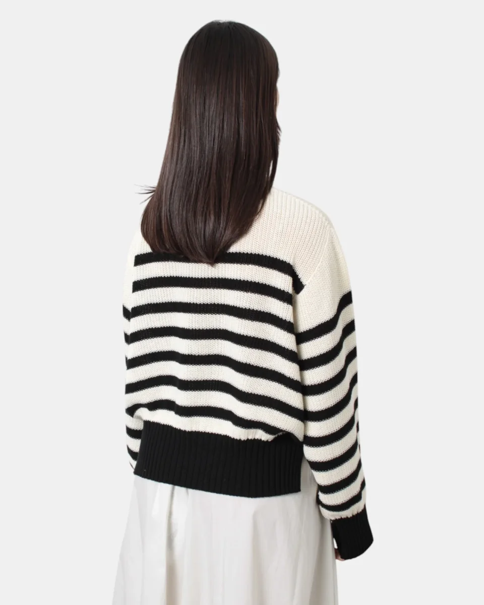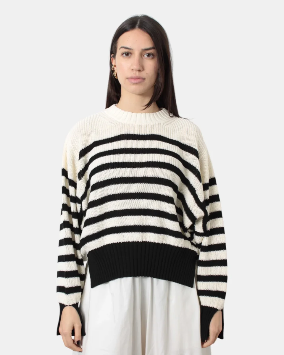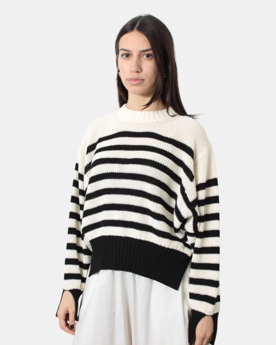 La maglia a girocollo di Roberto Collina presenta collo, fondo e polsi a coste, spacchetti sui polsi, spacchetti laterali, giro sceso e fantasia traforata con fasce orizzontali in contrasto di colore,dalla mano soffice e fresca dovuta alla sua composizione in 100% cotone. Si consiglia il lavaggio a mano. La modella è alta 1,68 m e indossa una S