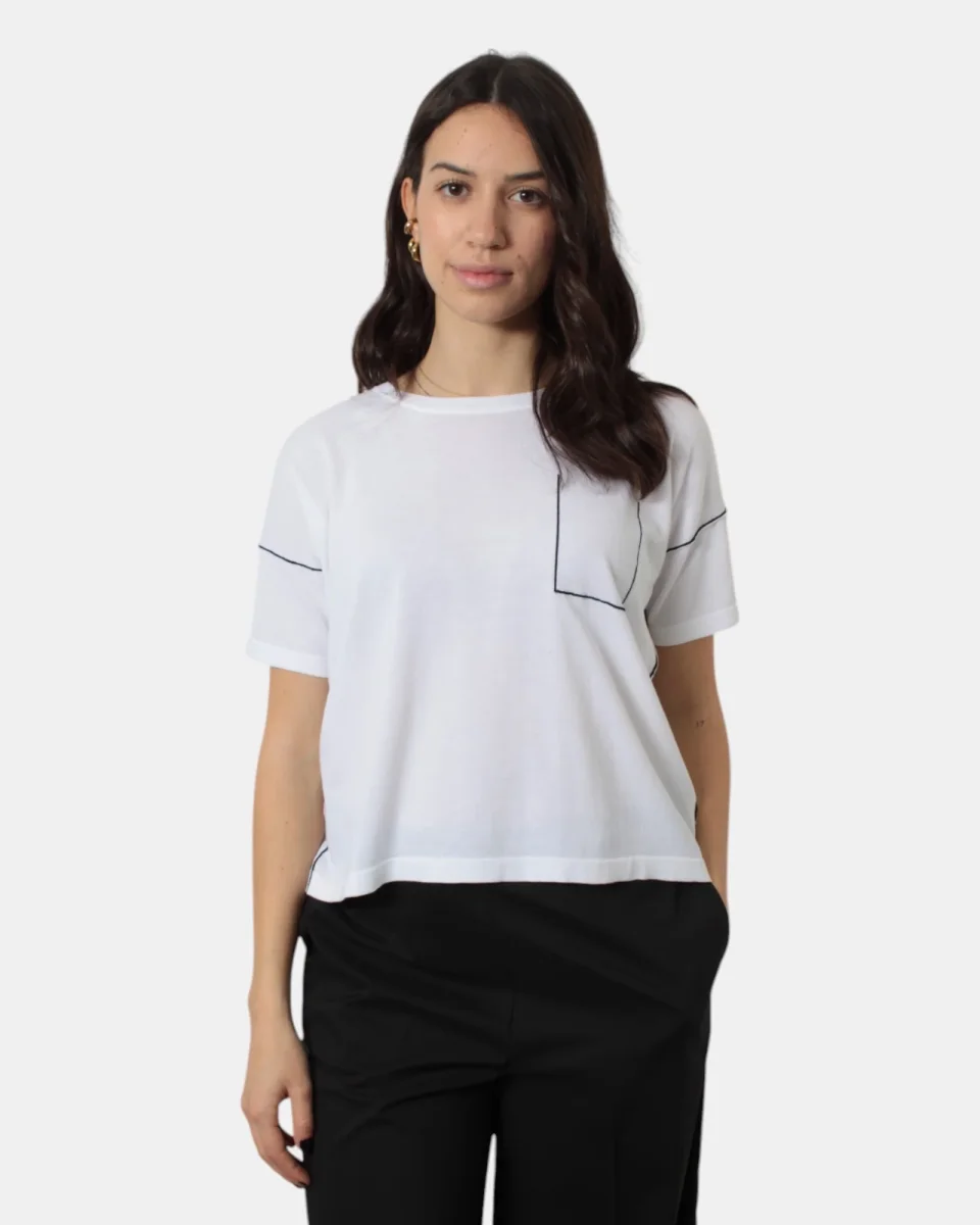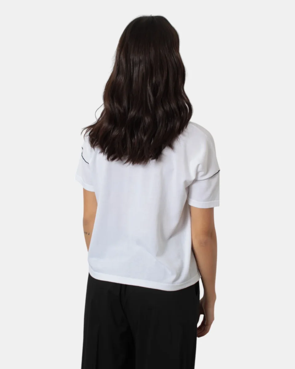 La maglia a girocollo a maniche corte di Roberto Collina presenta collo, maniche e fondo a costine, ricami in contrasto di colore, giro sceso, dalla mano fresca dovuta alla sua composizione in 100% cotone. Si consiglia lavaggio a mano. La modella è alta 1,68 m e indossa una S