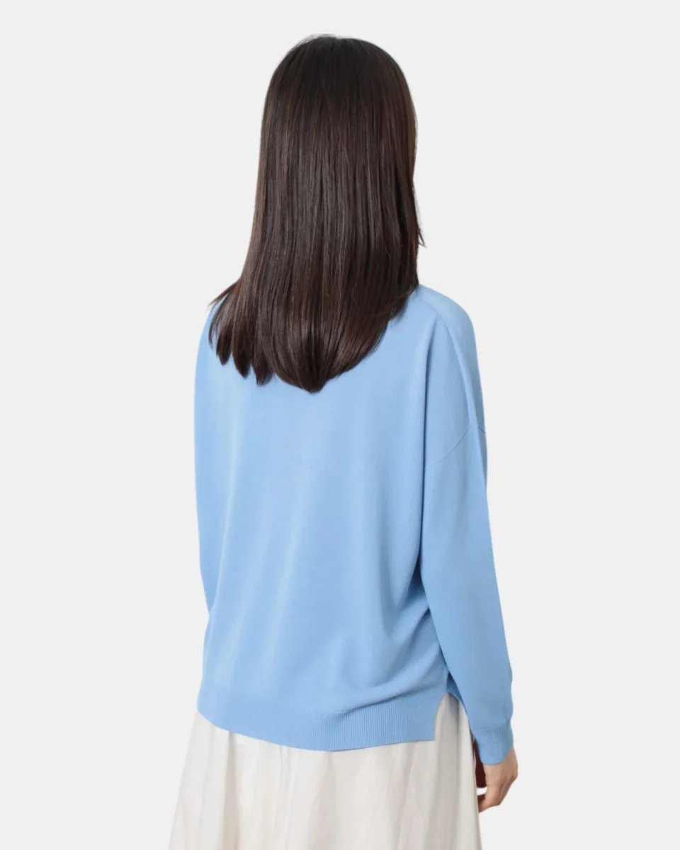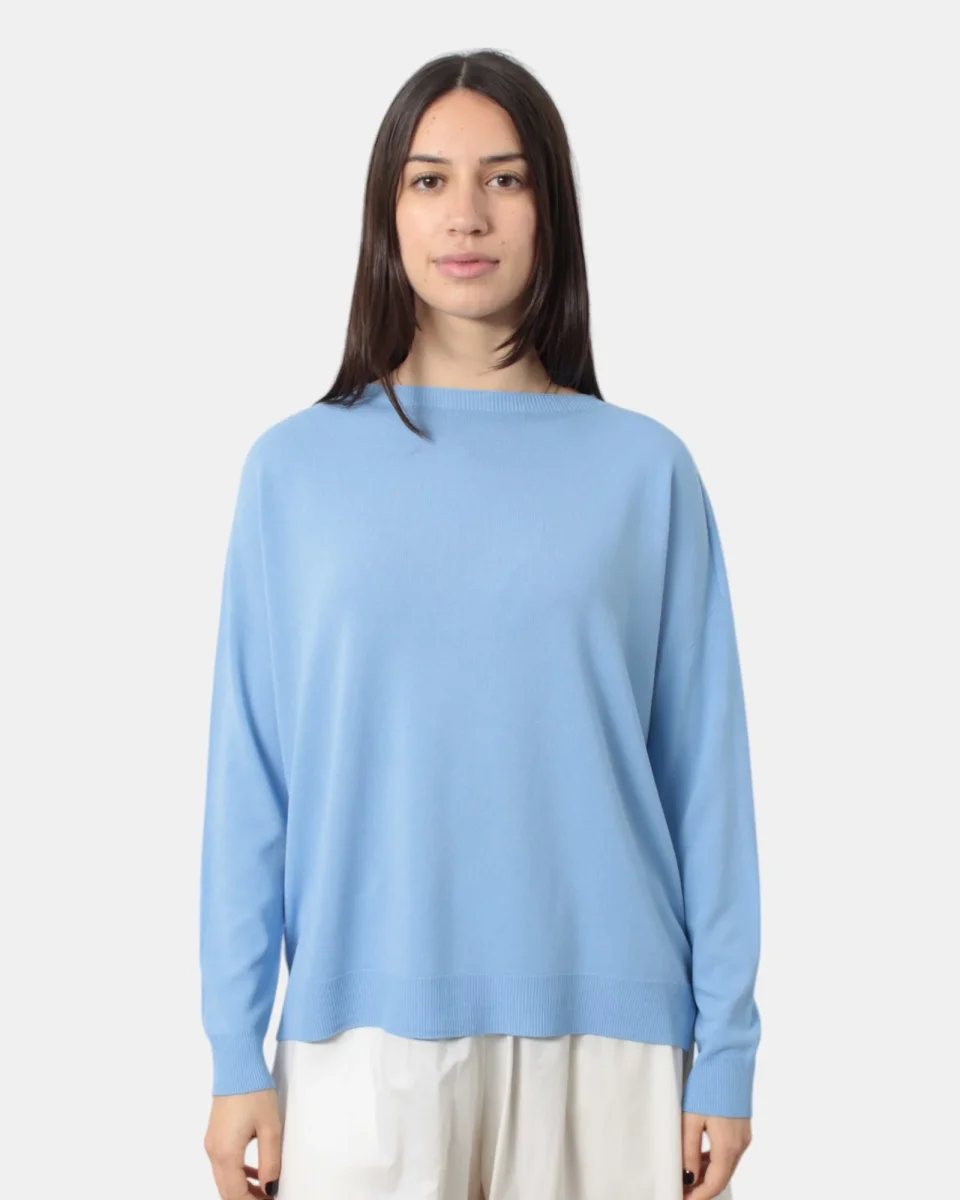 La maglia a girocollo a maniche lunghe di Solotre presenta collo, fondo e maniche a costine, dalla mano fresca dovuta alla sua composizione in 65% viscosa e 35% poliammide. SI consiglia lavaggio a mano. La modella è alta 1,68 m e indossa una 1