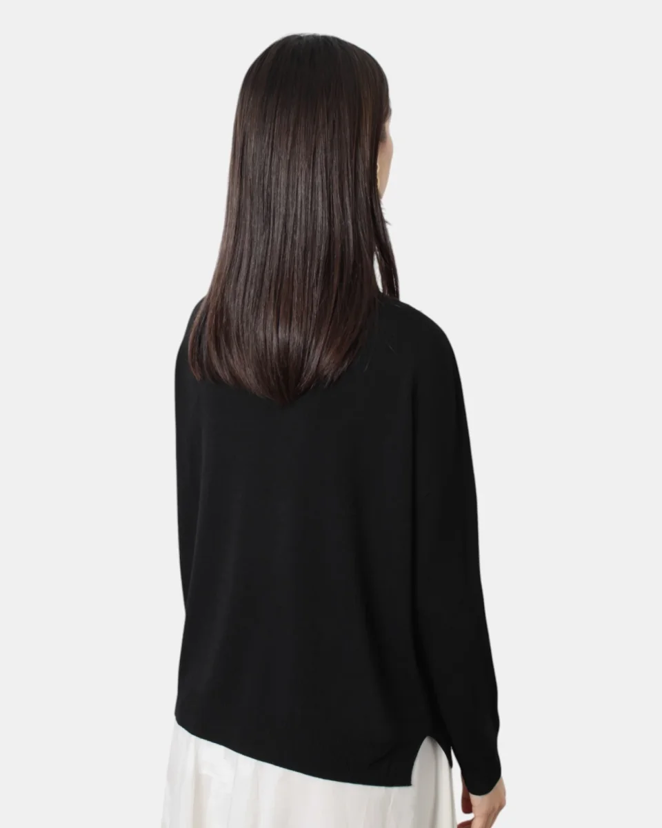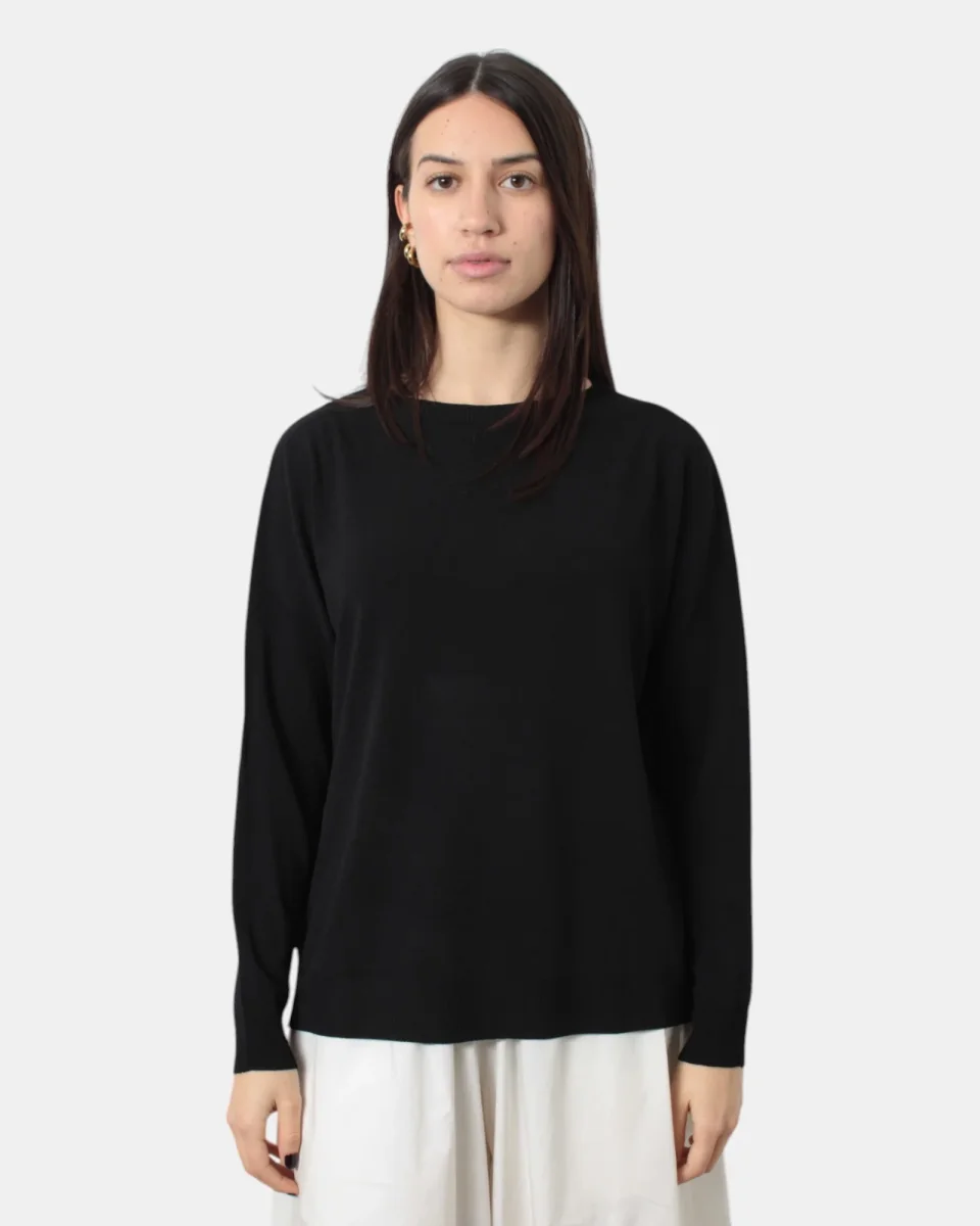 La maglia a girocollo a maniche lunghe di Solotre presenta collo, fondo e maniche a costine, dalla mano fresca dovuta alla sua composizione in 65% viscosa e 35% poliammide. SI consiglia lavaggio a mano. La modella è alta 1,68 m e indossa una 1