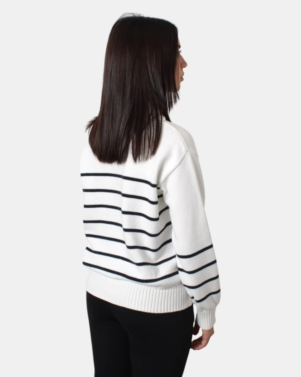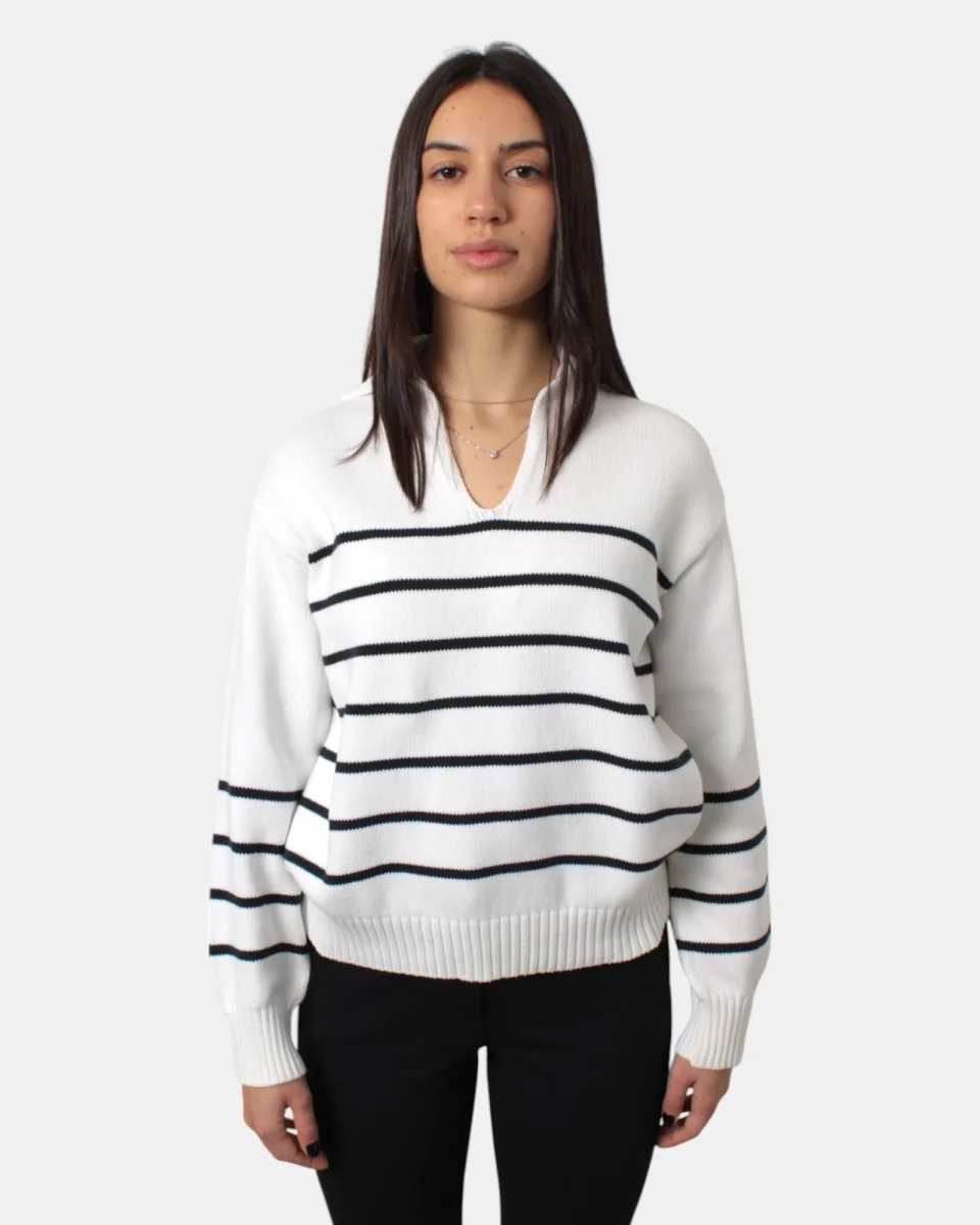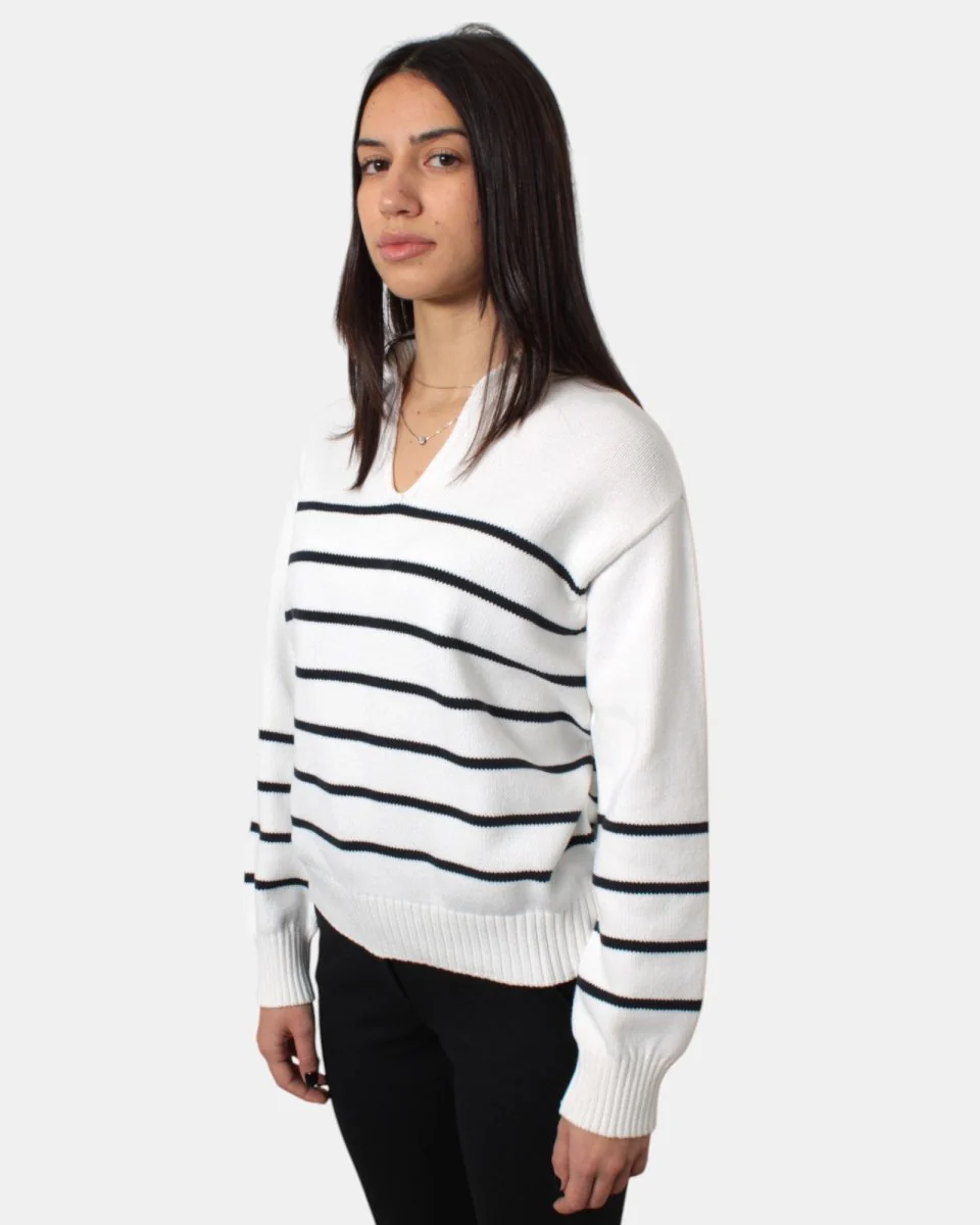 La maglia a v di Max Mara presenta scollo a V frontale, collo, polsi e maniche a costine, fantasia a righe orizzontali in contrasto, dalla mano calda e morbida dovuta alla sua composizione in 90% cotone e 10% poliestere. Si consiglia lavaggio a mano. La modella è alta 1,68m e indossa una XS