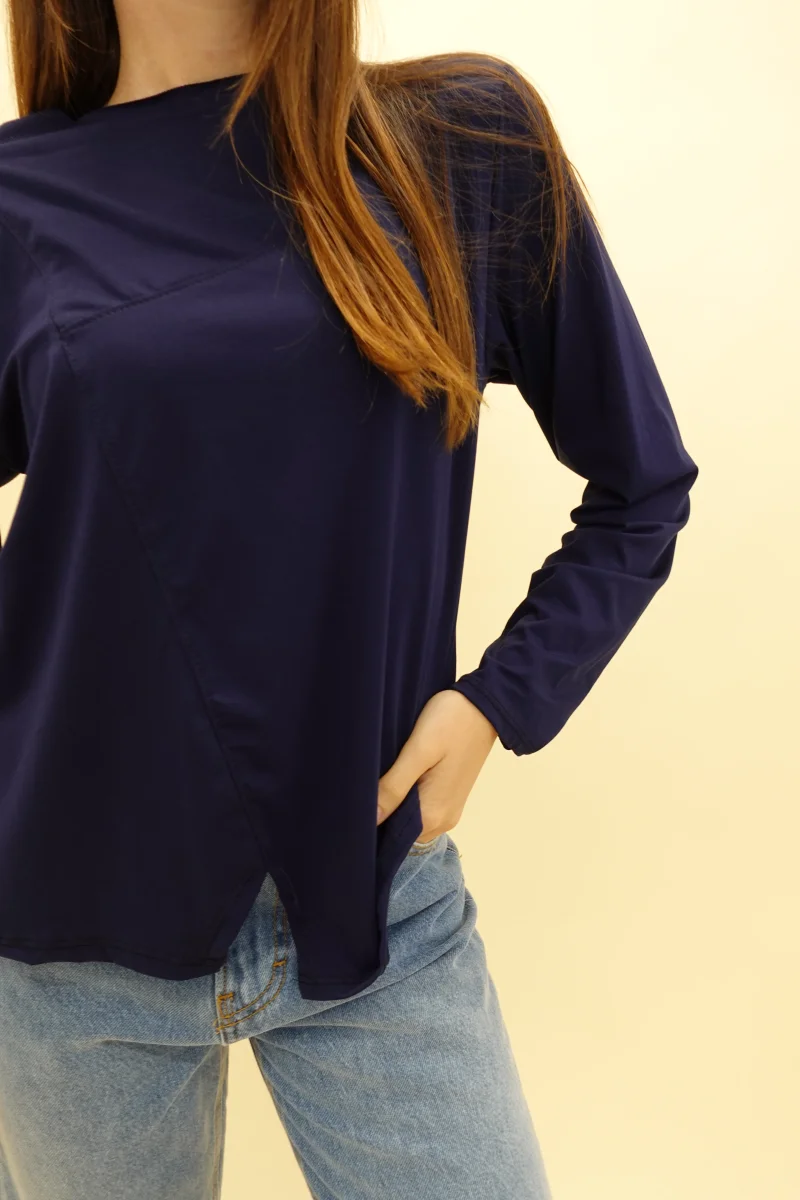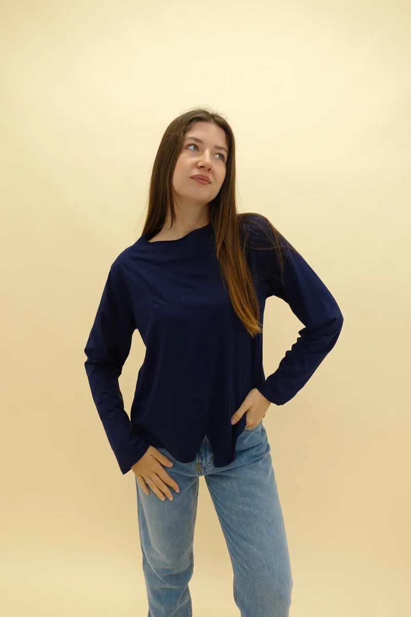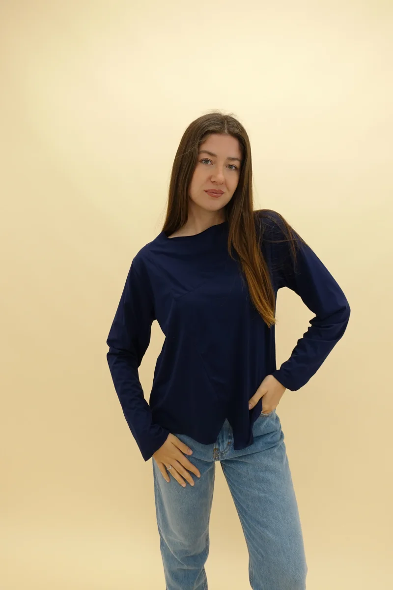 Maglia a girocollo con manica lunga, con taglio assimmetrico sul fondo