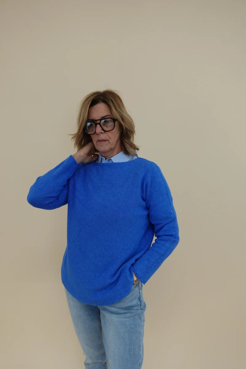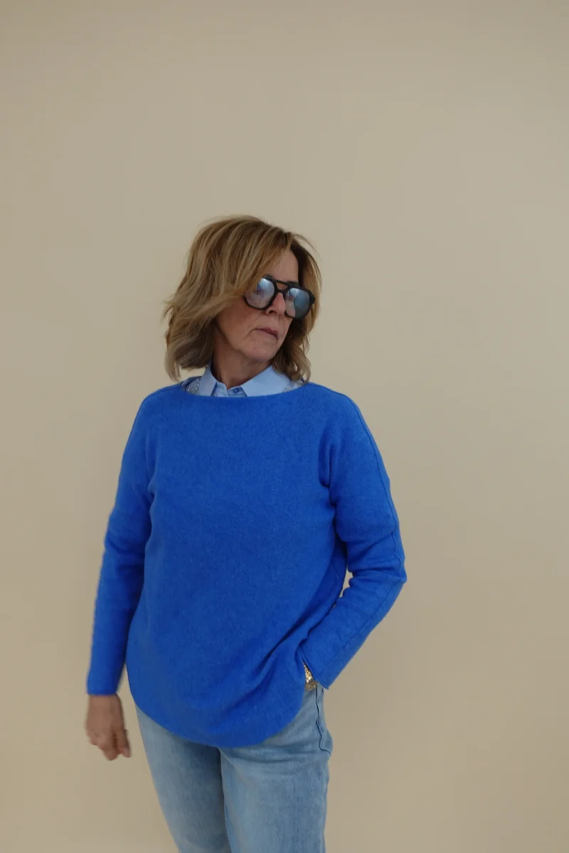 Maglia girocollo ampio, scende svasata ed arrontadata sul fondo
