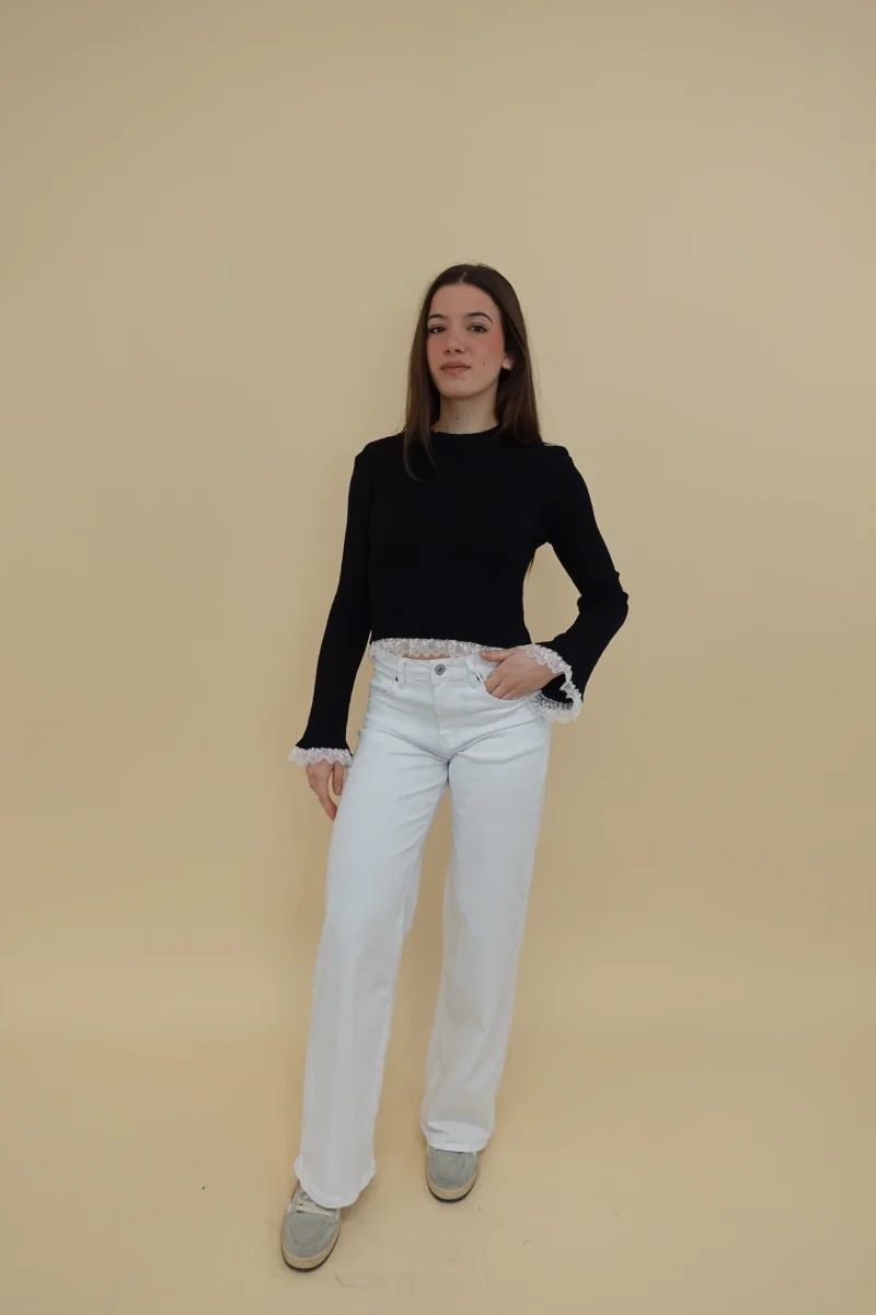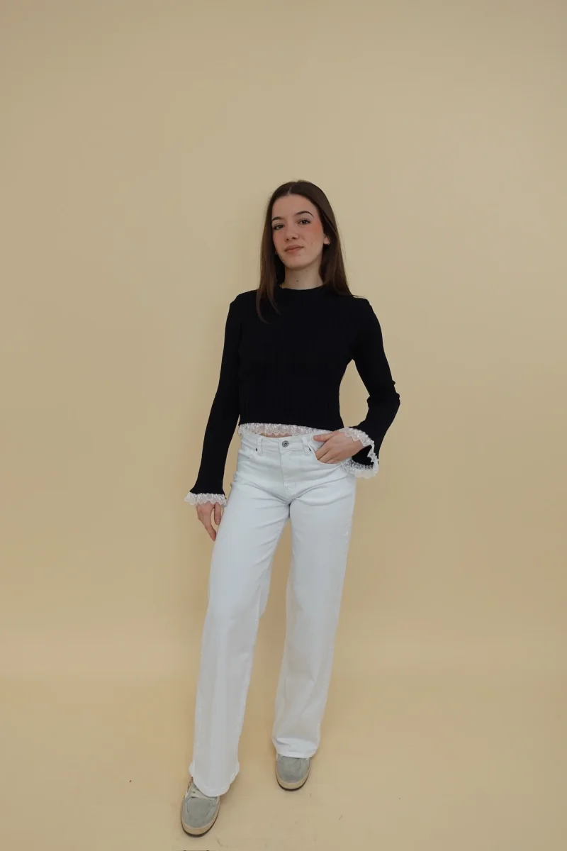 Maglia a girocollo, a costine elasticizzata. Con pizzo sulla manica e sul fondo