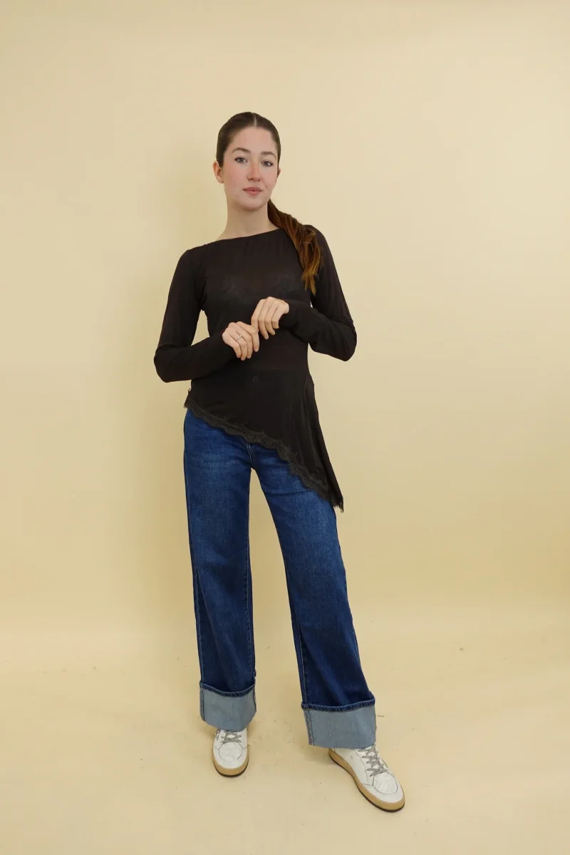 Maglia in misto cashmere con particolare dal lato e fondo in pizzo