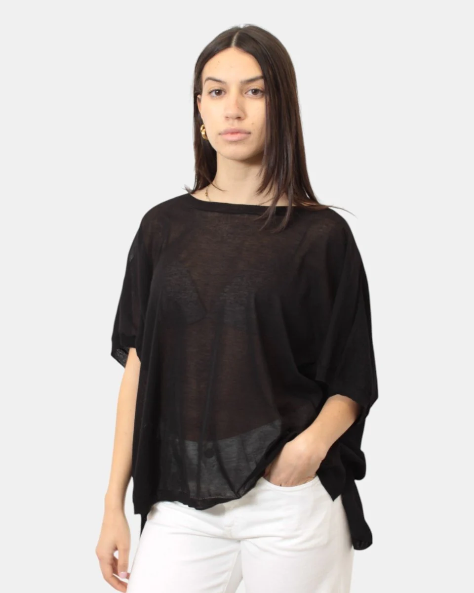 La maglia a girocollo di Meimeij presenta vestibilità ampia, dalla mano fresca dovuta alla sua composizione in 64% cotone e 36% poliestere. Si consiglia lavaggio a mano. La modella è alta 1,68 m e indossa una M