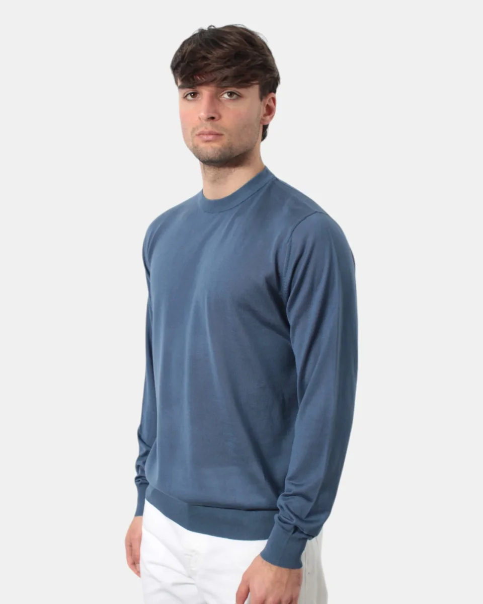 La maglia a manica lunga di Out fit presenta fondo, collo e polsi a costine, fantasia monocolore, dalla mano fresca e morbida dovuta alla sua composizione in 70% tencel, 15%seta e 15% cotone. Si consiglia lavaggio a massimo 30 gradi. Il modello è alto 1,78 m e indossa una L