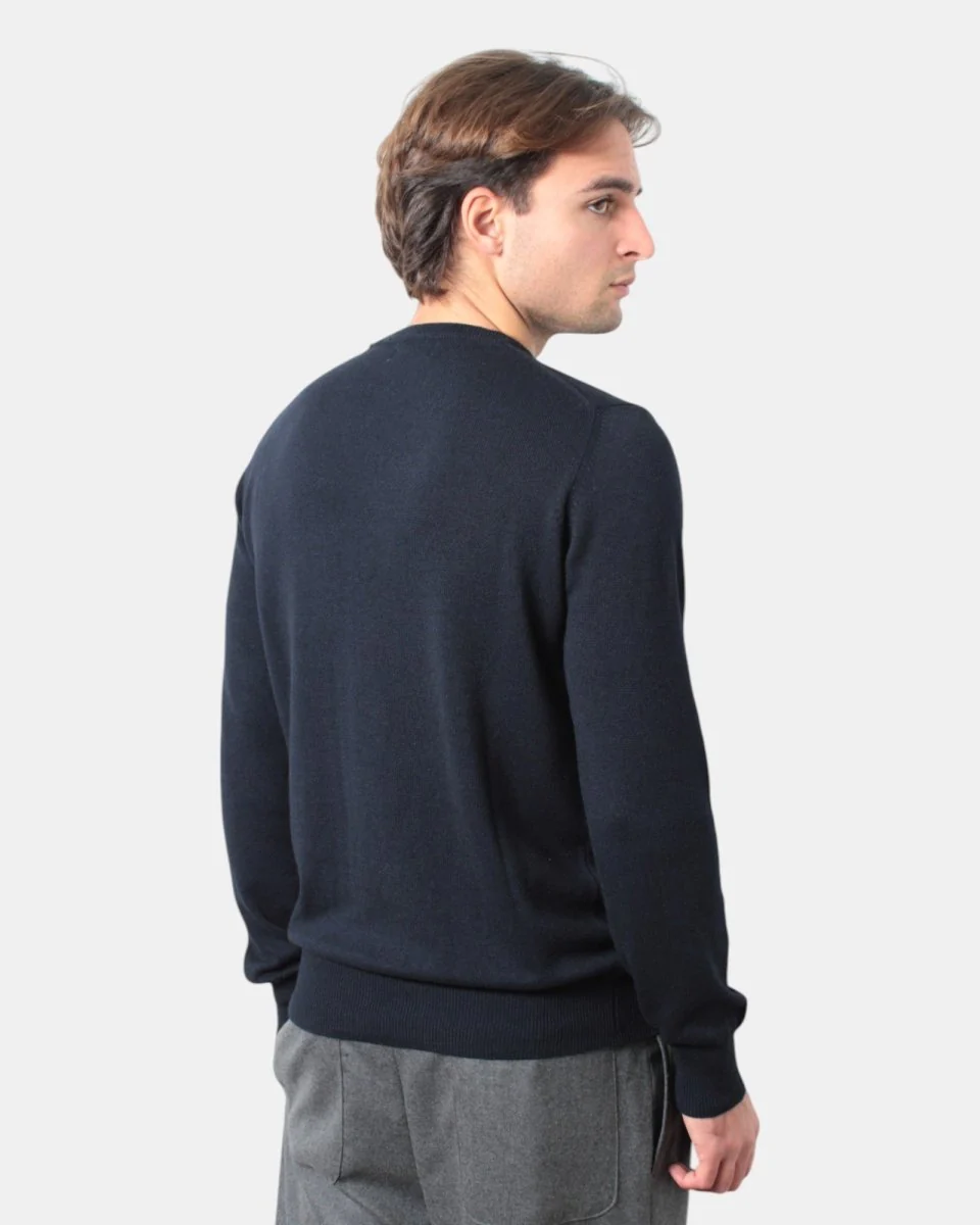 La maglia a girocollo di Maglificio Veneto presenta collo, polso e fondo a costine, vestibilità regular dalla mano soffice e morbida dovuta alla sua composizione in 33% lana, 33% viscosa, 24% poliammide e 10% cashmere. Si consiglia il lavaggio del capo a max 30 gradi. Il modello è alto 1,79 m e indossa una M