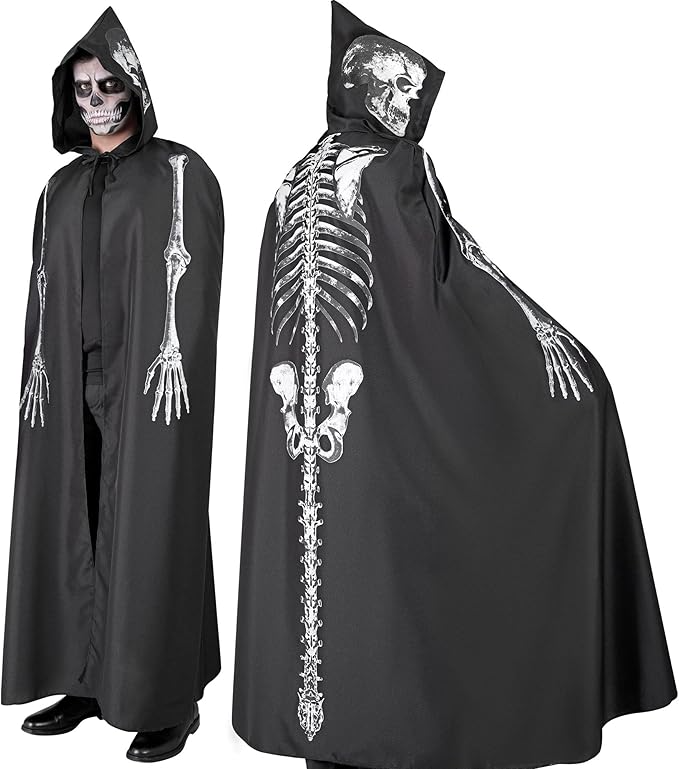- Il mantello nero con stampa dettagliata di scheletri bianchi sul davanti e sul retro crea un look di Halloween macabro e realistico