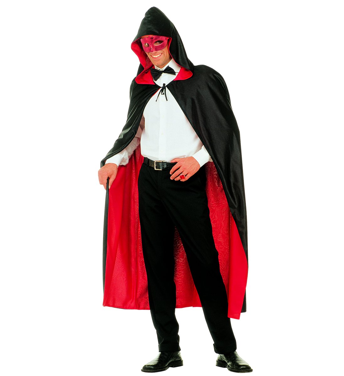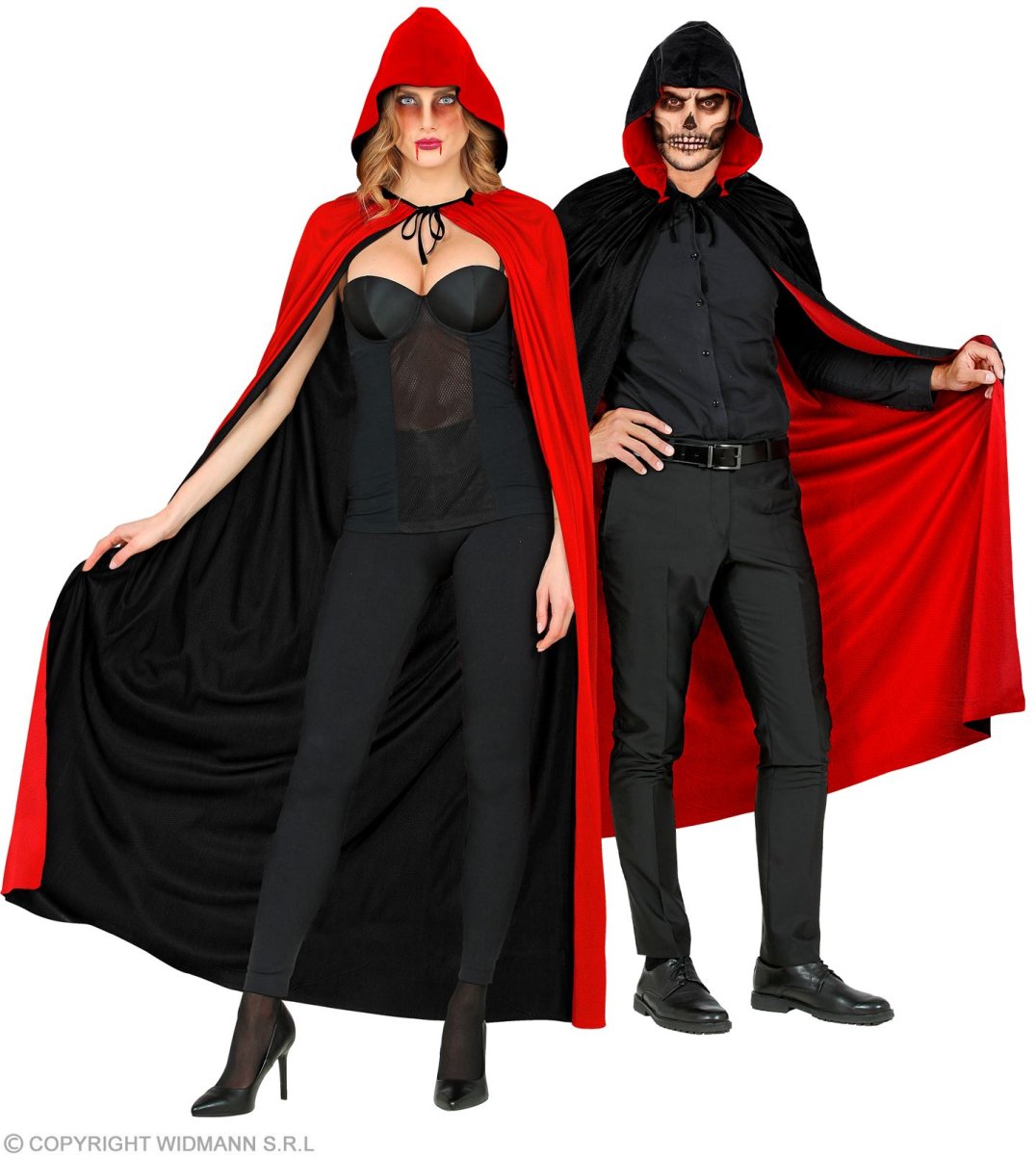 Mantello reversibile con cappuccio nero/rosso 140 cm da adulto; ideale per travestimenti ad halloween, carnevale, tutte le feste in maschera, saggi e recite.