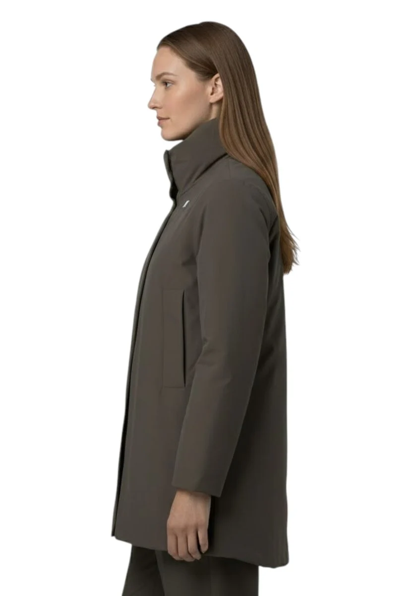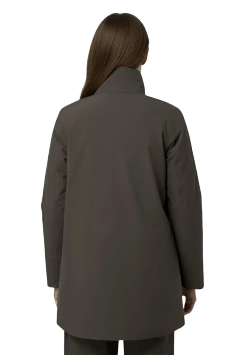 Il suo design pulito e contemporaneo è valorizzato dalla possibilità di regolare l’ampiezza sui fianchi tramite pratici bottoni a pressione nascosti, che permettono di passare da una linea dritta a una silhouette più svasata e femminile. Il cappuccio estraibile integrato nel collo alto offre ulteriore protezione contro il maltempo senza rinunciare all’estetica minimal del capo.