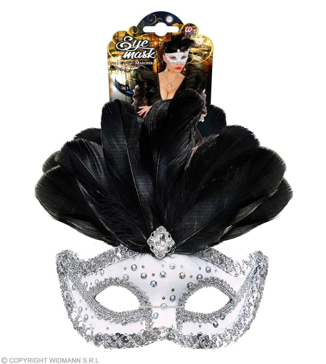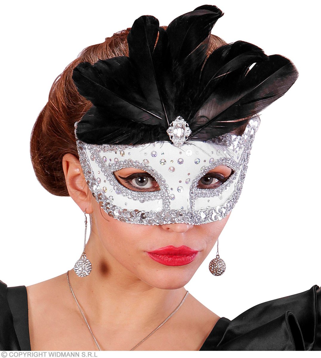 Maschera Rialto bianca con paillettes olografiche, gemma, finitura in paillettes argento e piume nere.