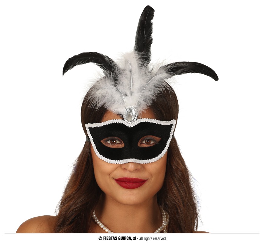 Maschera velluto nero con piuma bianca