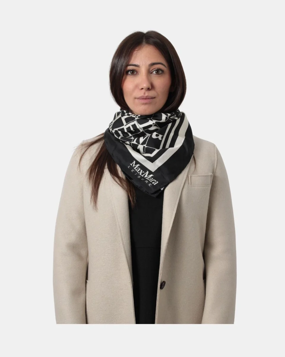 Il foulard di Max Mara presenta fantasia con scritte brand, dalla mano morbida dovuta alla sua composizione in 100% seta