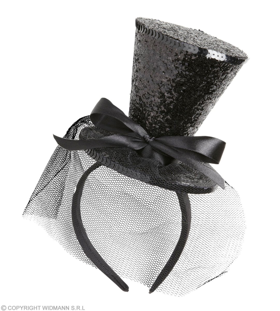 MINI CILINDRO NERO GLITTER SU CERCHIETTO CON FIOCCO E VELO
