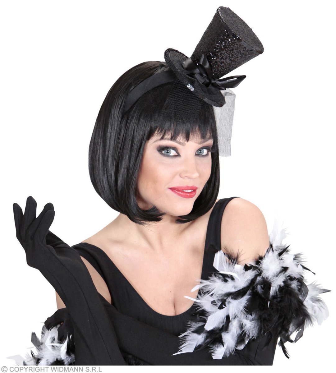 Mini cilindro nero glitter su cerchietto con fiocco e velo