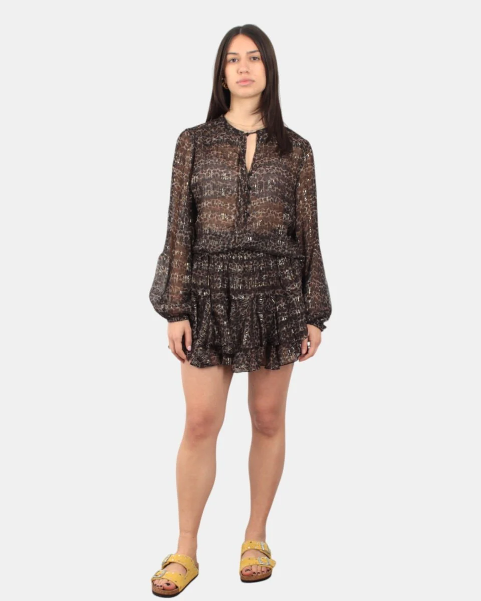 La gonna di MC2 Saint Barth in lurex presenta fantasia leopardata, elastico in vita, frange, dalla mano fresca e leggera dovuta alla sua composizione in 74% viscosa, 23% seta e 3% lurex. Si consiglia lavaggio a mano. La modella è alta 1,68 m e indossa una S