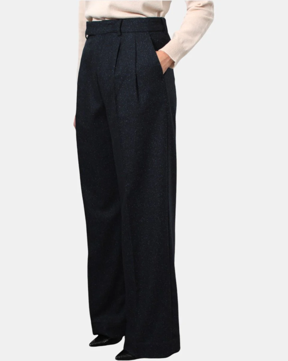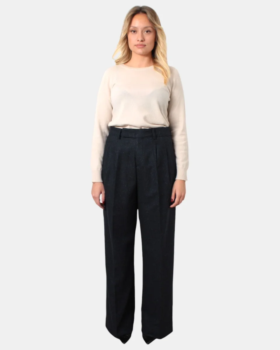 Il pantalone di Briglia modello WHITEW presenta due tasche america, cinturino con chiusura con zip e bottone, due tasche posteriori a filetto, due pens, caratterizzato dal tessuto tweed, la sua composizione è in 60% lana vergine, 18% poliamide, 10% seta, 5% poliestere e 2% elastan, vestibilità larga. Si consiglia il lavaggio a secco. La modella è alta 1,70 m e indossa una 40