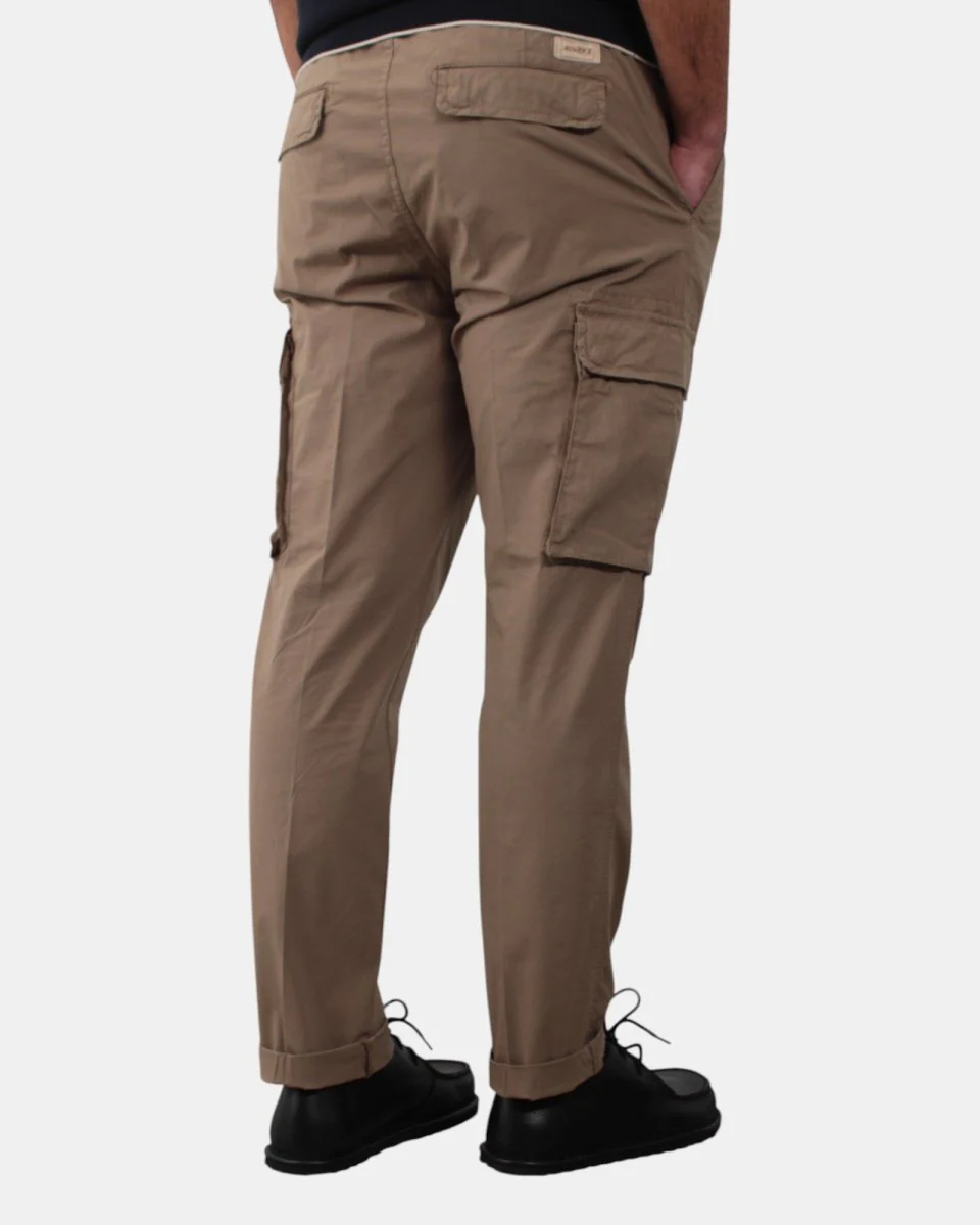 Il pantalone cargo di 40Weft presenta quattro tasche, lacci in vita, chiusura con zip e bottone, dalla mano fresca dovuta alla sua composizione in 97% cotone e 3% elastan. Si consiglia lavaggio a massimo 30 gradi. Il modello è alto 1,78 m e indossa una 48