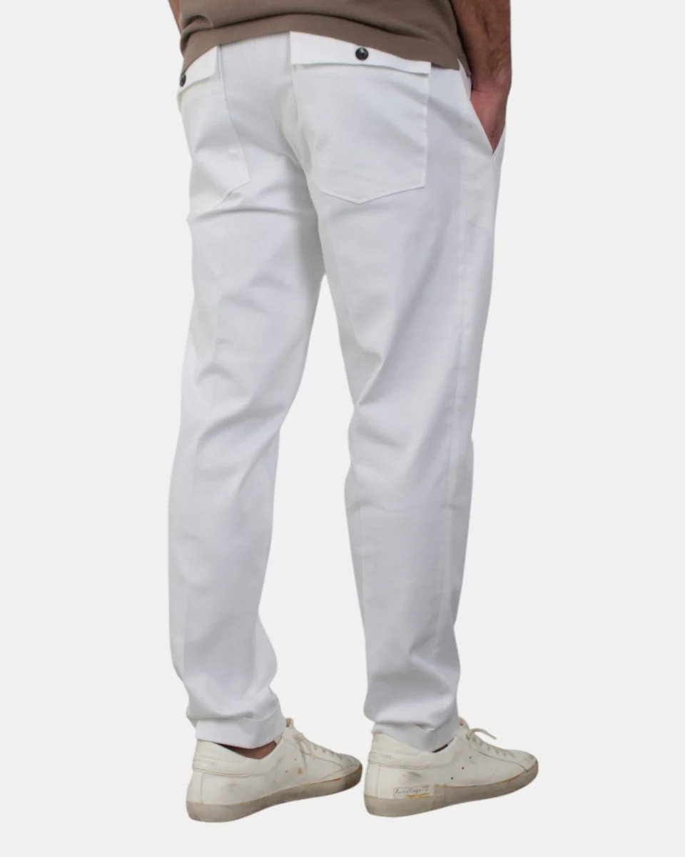 Il pantalone cargo di Michele Carbone presenta chiusura con zip e bottone, due tasche frontali e due sul retro con bottone e pattina, dalla mano fresca dovuta alla sua composizione in 49% lyocell 49% cotone 2% elastan . Si consiglia lavaggio a massimo 30 gradi. Il modello è alto 1,78 m e indossa una 32