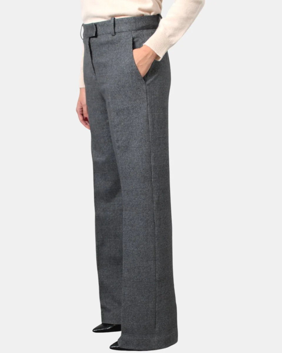 Il pantalone fantasia galles di Circolo presenta chiusura con zip e passanti con due tasche laterali, una tasca posteriore con chiusura a un bottone, vestibilità morbida per la sua composizione 95% cotone e 5% elastan. Si consiglia lavaggio a mano e stiratura a bassa temperatura. La modella è alta 1,67 m e indossa una 40.