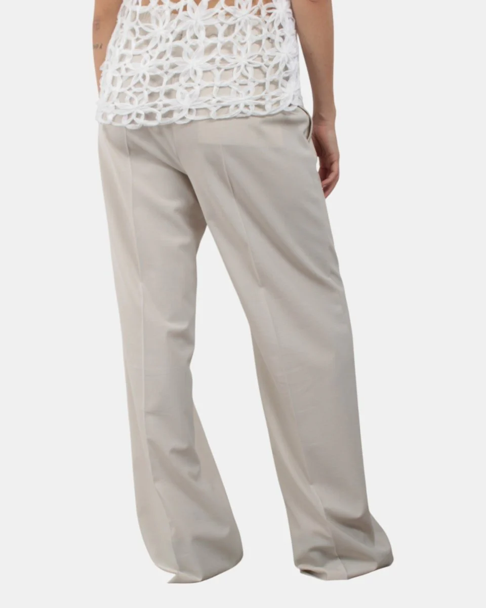 Il pantalone Jucca presenta una linea palazzo in misto lana, con vita media, passanti ed elastico sul retro. Chiusura con zip e gancetto, tasche laterali alla francese e una tasca a filetto sul retro. Composizione: 53% poliestere, 43% lana vergine, 4% elastan. Si consiglia lavaggio a mano. La modella è alta 1,68 m e indossa una 42