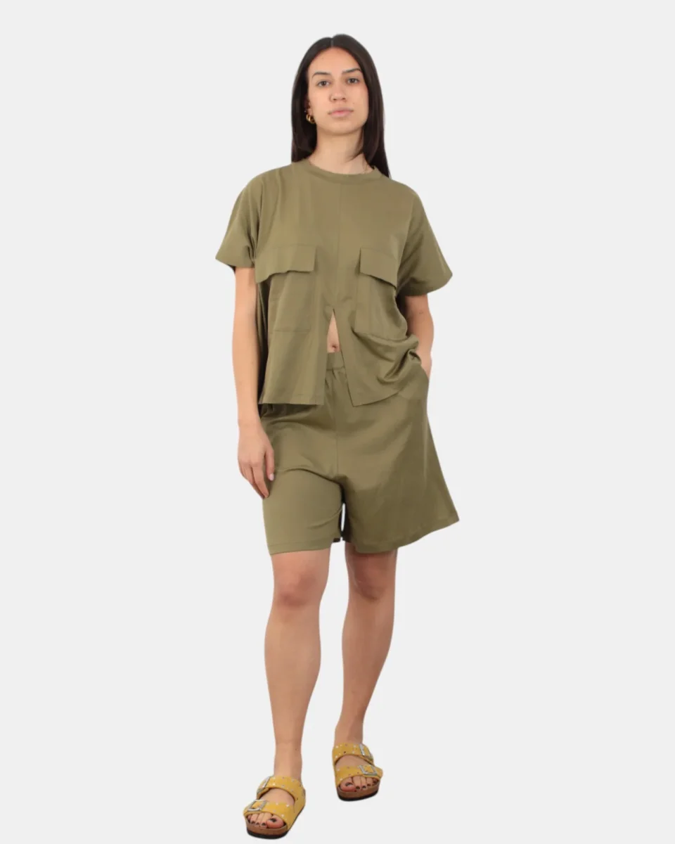 Il bermuda di Jei-O presenta fantasia monocolore, due tasche frontali, elastico in vita, dalla mano fresca dovuta alla sua composizione in 100% cotone. Si consiglia lavaggio a mano. La modella è alta 1,68 m e indossa una S