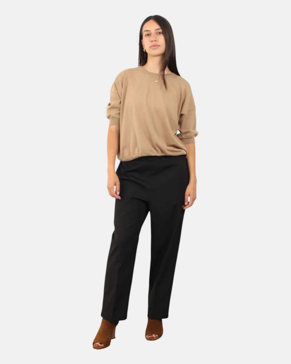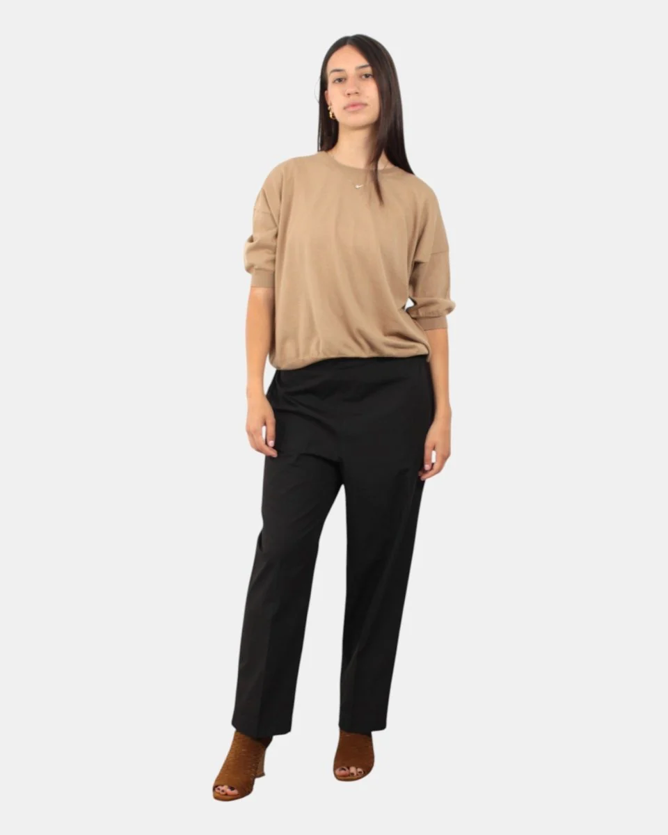 Il pantalone Jucca presenta elastico sul retro. Composizione: 100% cotone. Si consiglia lavaggio delicato a massimo 30 gradi. La modella è alta 1,68 e indossa una 42.