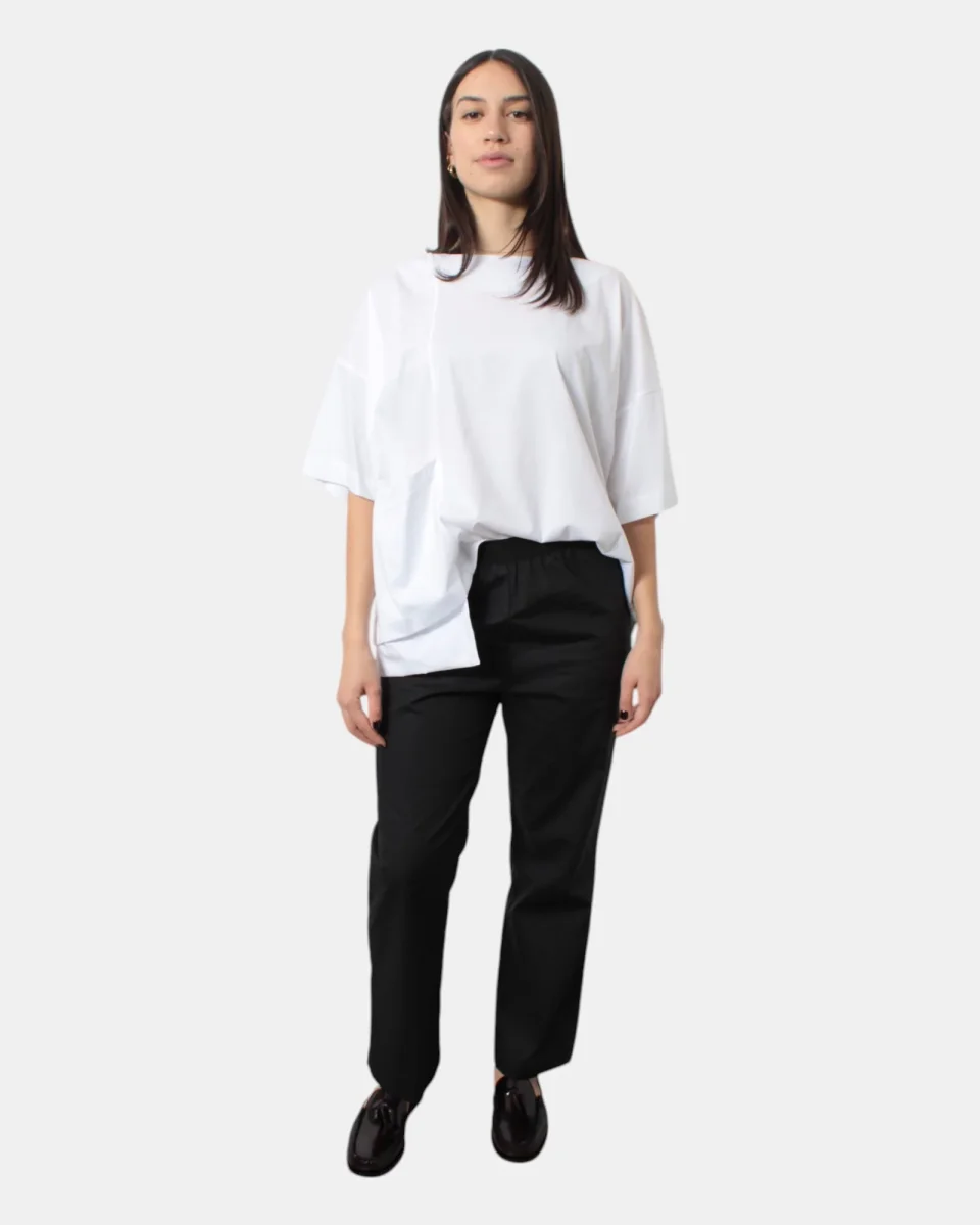 Il pantalone di Meimeij presenta elastico in vita, vestibilità regolare, dalla mano fresca dovuta alla composizione in 100% poliestere. Si consiglia il lavaggio a massimo 30 gradi. La modella è alta 1,68 e indossa una 40
