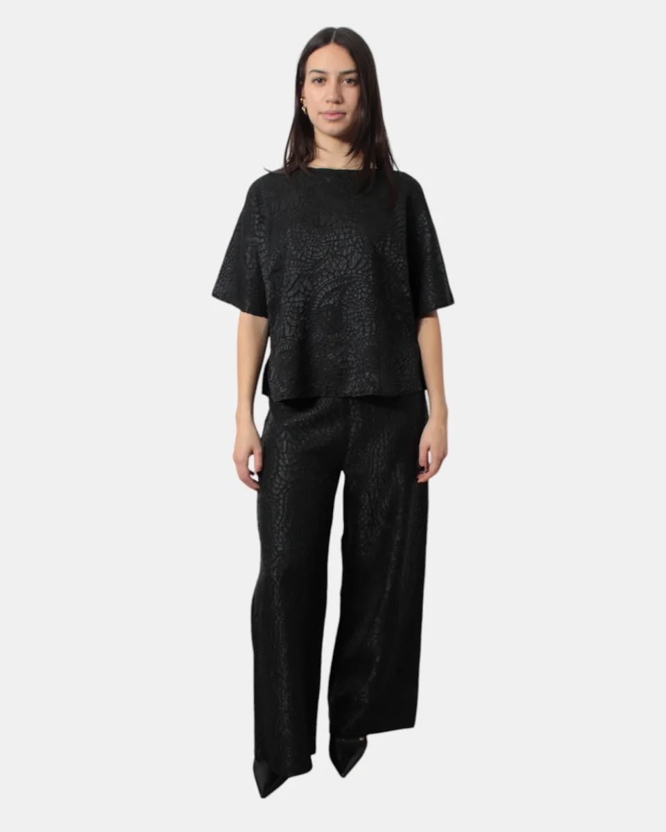 Il pantalone di Meimeij presenta elastico in vita, fantasia iconica brand in tinta, vestibilità ampia, dalla mano fresca dovuta alla composizione in 100% poliestere. Si consiglia il lavaggio a massimo 30 gradi. La modella è alta 1,68 e indossa una 40