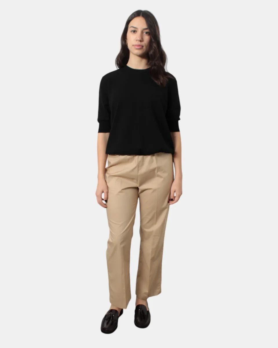 Il pantalone di Meimeij presenta elastico in contrasto di colore, vestibilità ampia, dalla mano fresca dovuta alla composizione in 100% cotone. Si consiglia lavaggio a mano . La modella è alta 1,68 m e indossa una 40