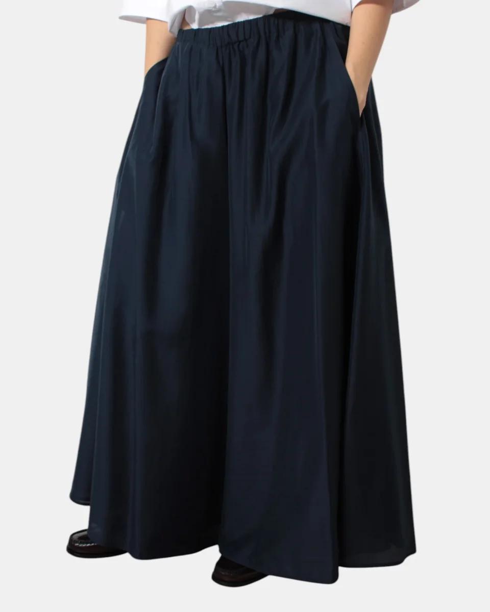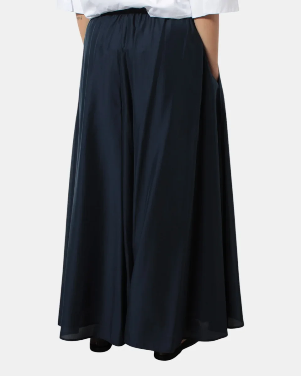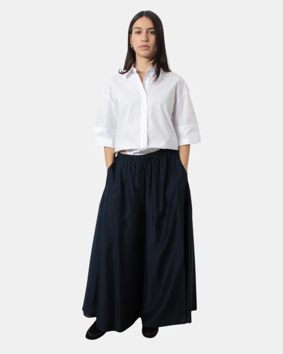 Il pantalone di Meimeij presenta elastico in vita, tasche frontali, fantasia monocolore, vestibilità ampia, dalla mano fresca dovuta alla sua composizione in 85% lyocell e 15% elastan. Si consiglia lavaggio a massimo 30 gradi. La modella è alta 1,68 m e indossa una 40