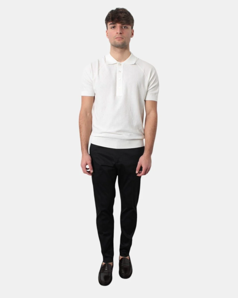 Il pantalone modello tasca a filo di Michele Carbone presenta tasche frontali, due tasche a filetto sul retro, dalla mano morbida e fresca dovuta alla sua composizione in 54% poliestere, 44% lana 2% elastan. Si consiglia il lavaggio a massimo 30 gradi. Il modello è alto 1,78 m e indossa una 32